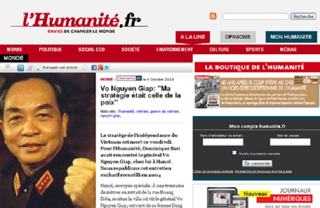 L'Humanité dành vị trí quan trọng đưa tin về Đại tướng Võ Nguyên Giáp. Ảnh chụp màn hình
