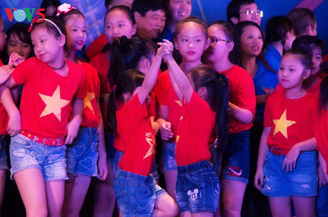 | Tốp ca Đoàn Thanh niên VOV cùng các em thiếu nhi đội Sơn Ca thể hiện liên khúc "Trái tim Việt Nam" và "Nối vòng tay lớn". |