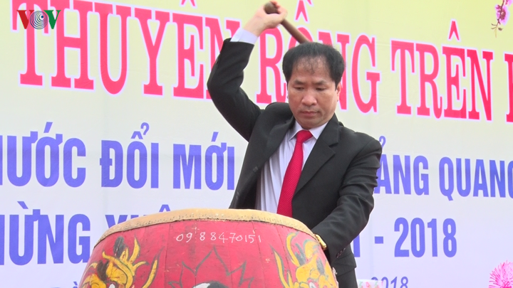| Hội đua thuyền rồng trên biển là lễ hội mang ý nghĩa linh thiêng, trang trọng của nhân dân Đồ Sơn để cầu mong một năm người người được bình an, mạnh khoẻ, mưa thuận gió hòa, ra khơi bội thu tôm cá. Ảnh: Ông Hoàng Xuân Minh - Chủ tịch quận Đồ Sơn đánh trống khai hội thi. |