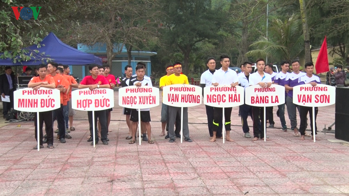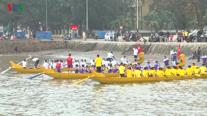 | Năm nay, trong tiết trời nắng ấm đầu xuân, biển lặng là điều kiện lý tưởng để tổ chức Hội đua thuyền rồng trên biển. Trong ảnh, đội áo tím là đội đua của phường Vạn Sơn. |