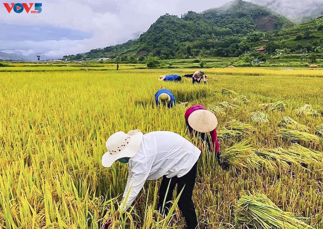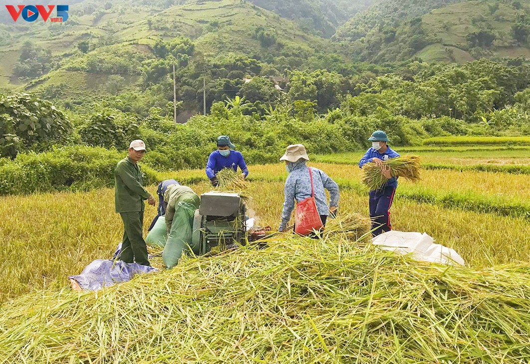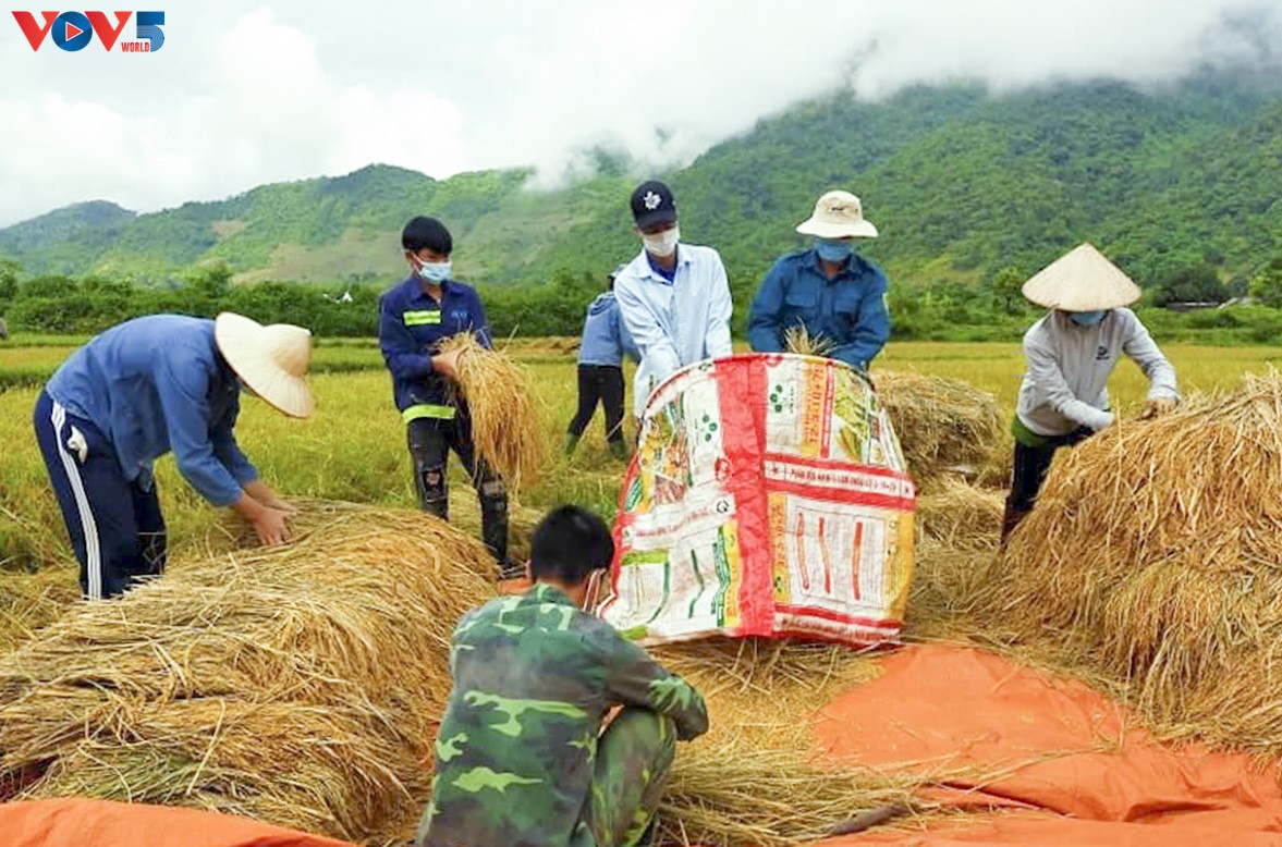 Toàn bộ diện tích lúa đang chín của 35 hộ dân đang thực hiện cách ly tập trung, gia đình neo đơn, gia đình có người thực hiện nghĩa vụ quân sự đang được khẩn trương tiến hành gặt.