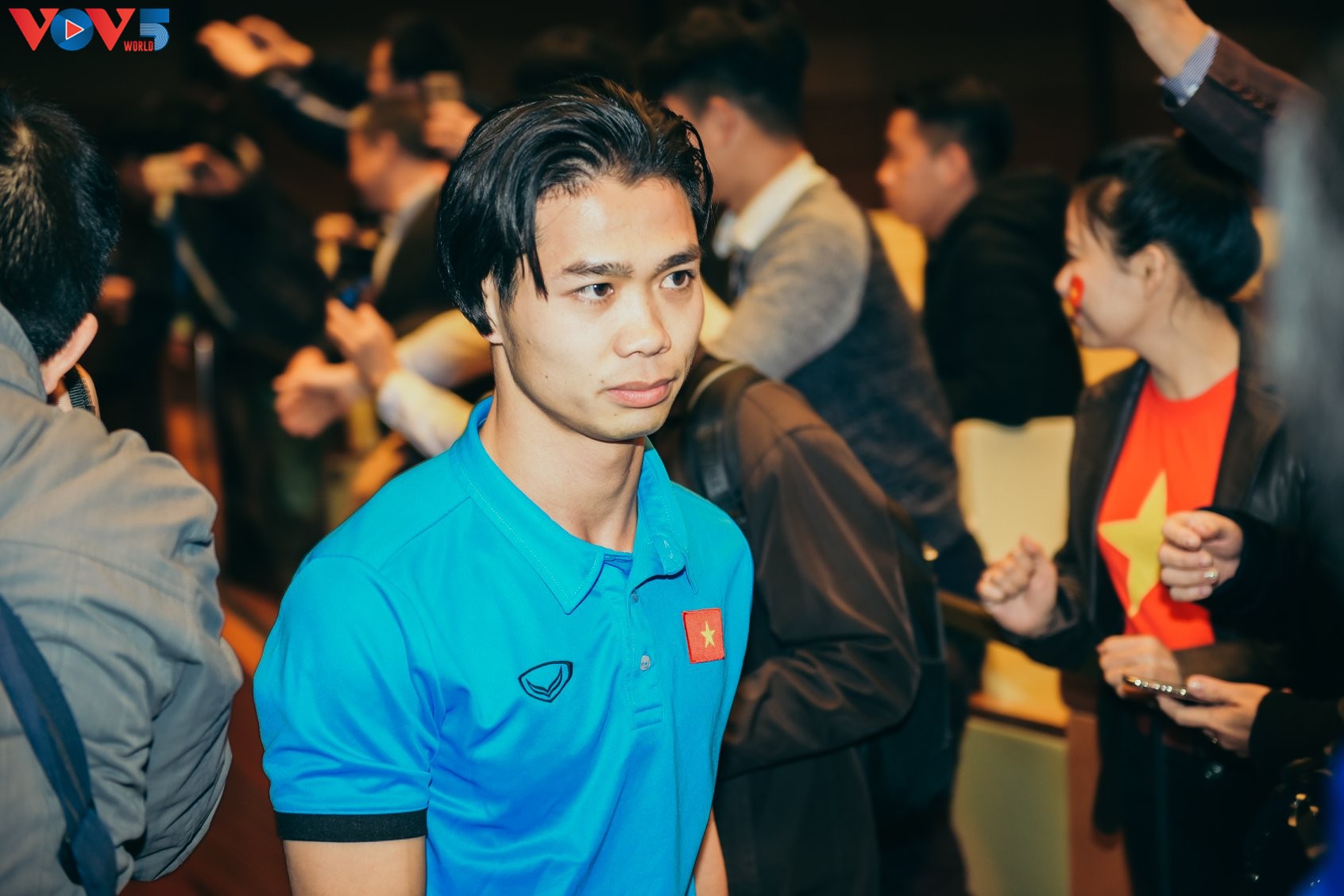 HLV Park Hang Seo dẫn đầu đoàn, tiến vào Phòng họp Diên Hồng. |