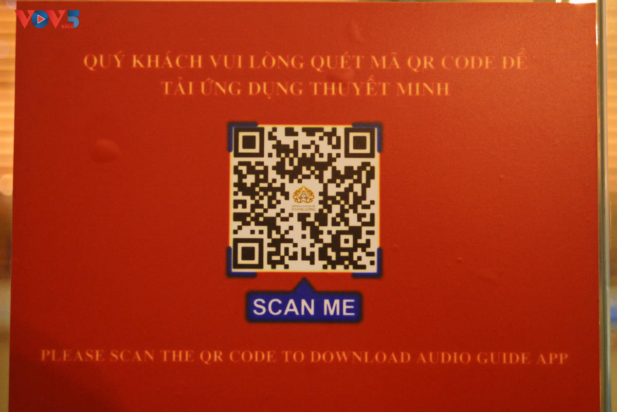 | Bảng hướng dẫn sử dụng ứng dụng thông minh quét mã QR viết bằng tiếng Việt và tiếng Anh đặt ở bên mô hình thu nhỏ khu di tích Hoàng Thành Thăng Long. |