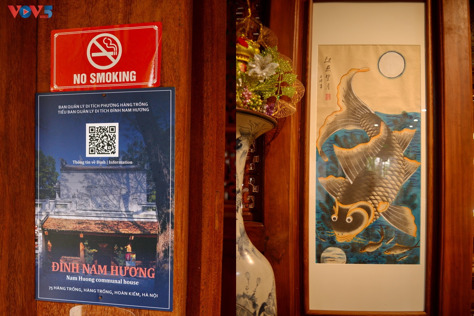 | Tại phường Hàng Trống, đình Nam Hương, dòng tranh Hàng Trống cũng là một trong nhiều địa điểm được gắn mã QR giúp du khách thuận tiện hơn trong tìm hiểu. Ảnh: Cổng vào nhà trưng bày tại đình Nam Hương với mã QR treo bên trái. |