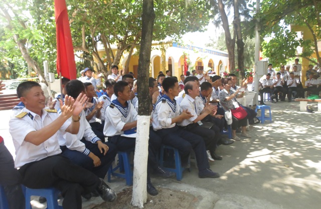 | Bà con kiều bào cùng các chiến sĩ đảo Sơn Ca cùng vui văn nghệ. Ảnh: Phạm Đạt |