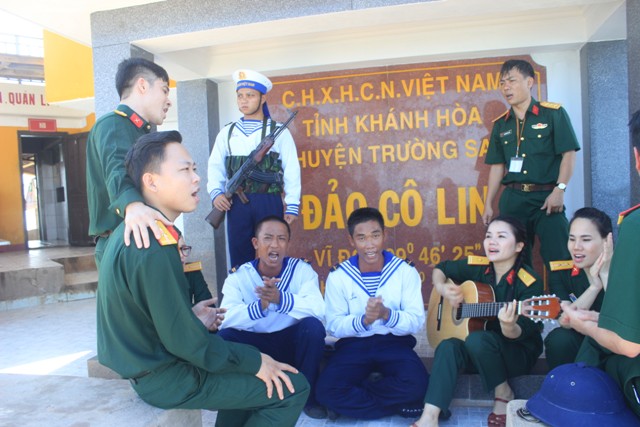 | Sân khấu ở đây là cột mốc đảo Cô Lin. Các nghệ sĩ, diễn viên và người lính đảo hát mê mải cùng cây đàn ghi ta bập bùng |
