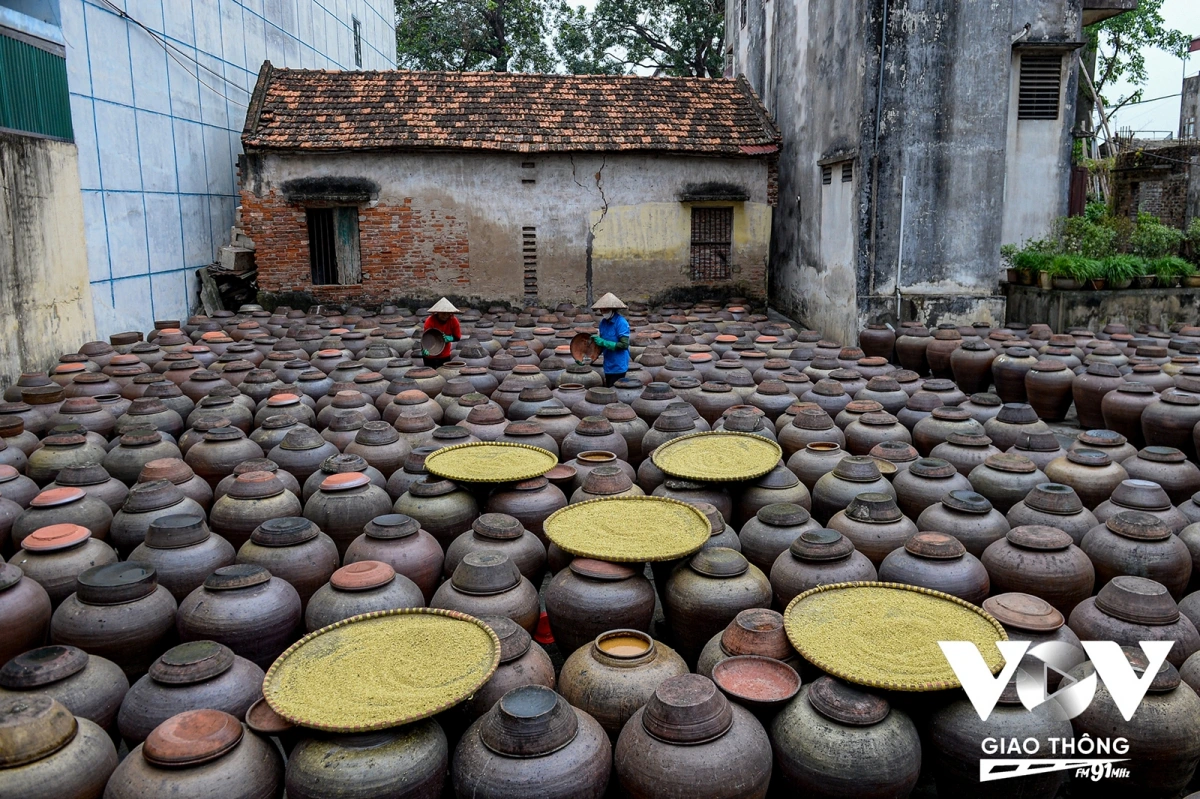 | Hiện trong khuôn viên của gia đình cụ Minh Quất vẫn giữ lại nếp nhà cổ kính, trong sân có khoảng 800 chum làm tương, mỗi chum từ khoảng 100-110 lít. |