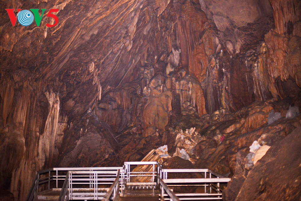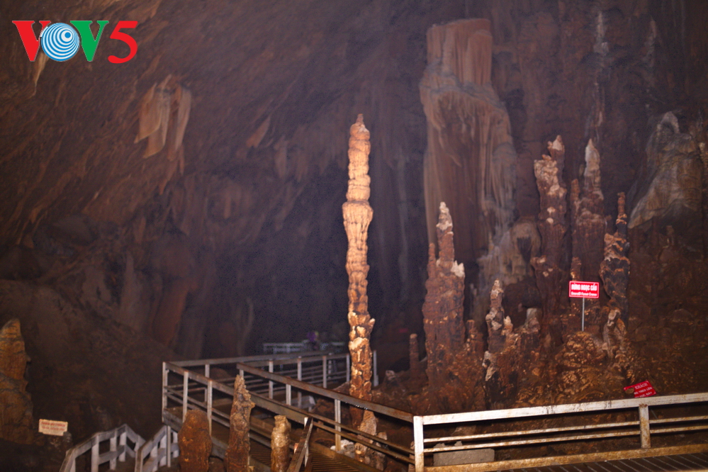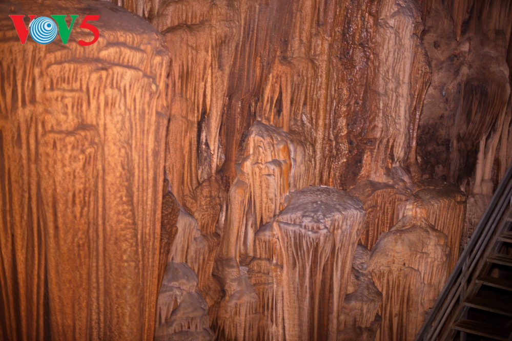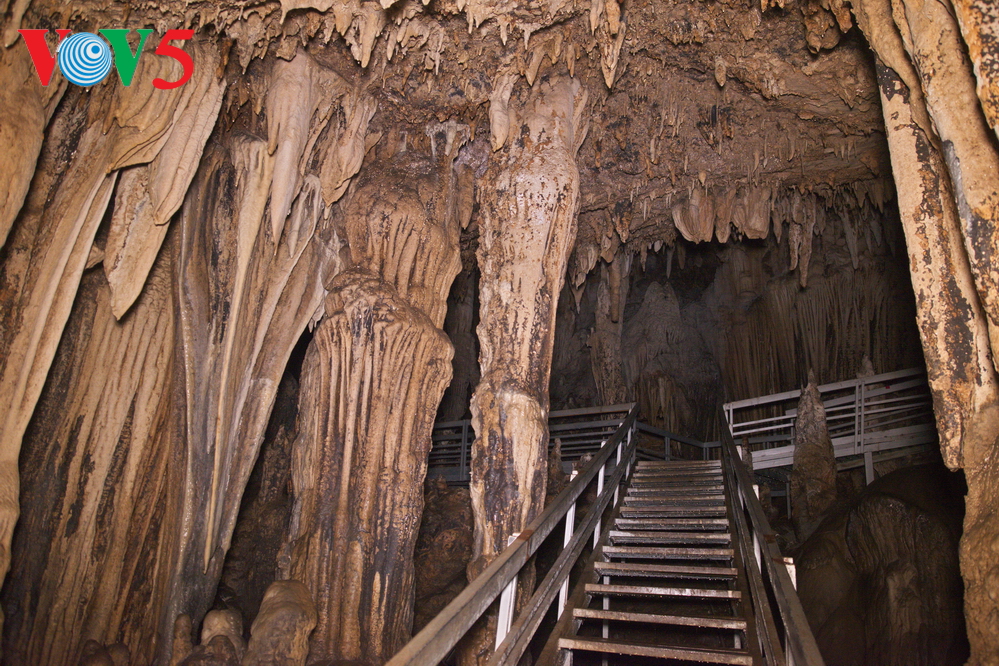 | Bên trong động là không gian rộng lớn với những cột thạch nhũ còn nguyên vẹn. |