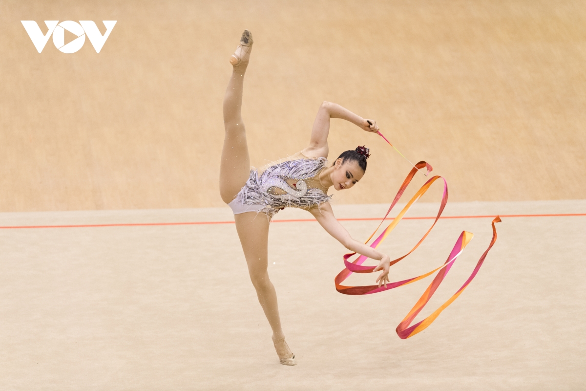 Vận động viên Nguyễn Hà My trong phần thi với lụa. |