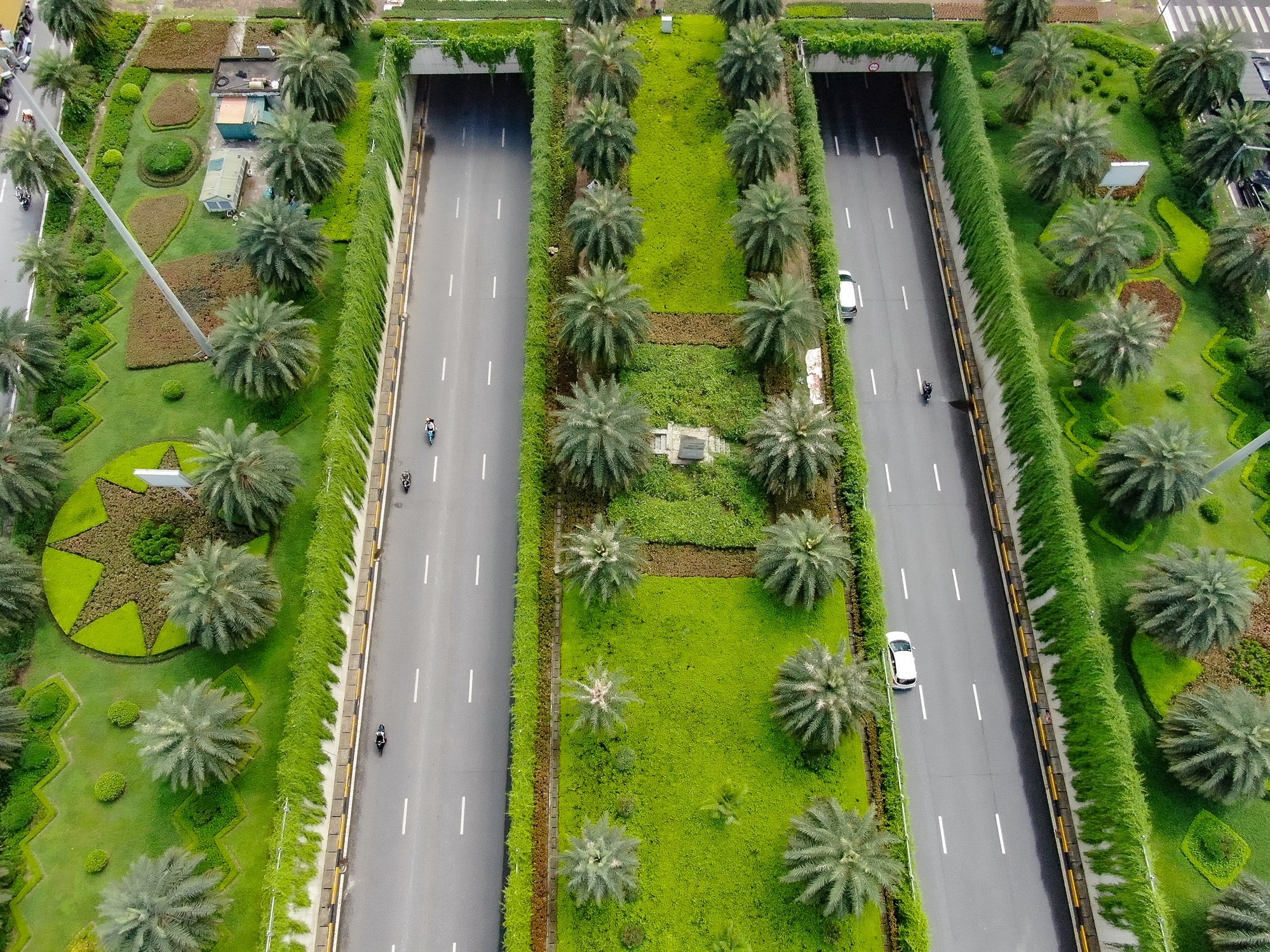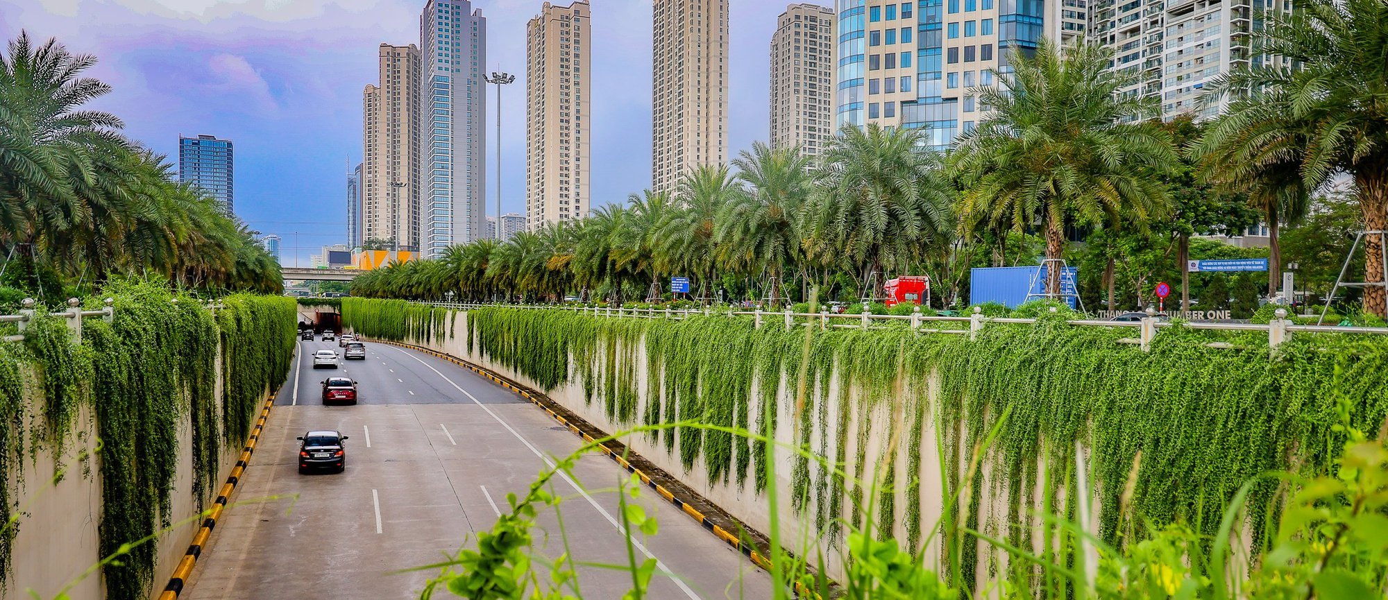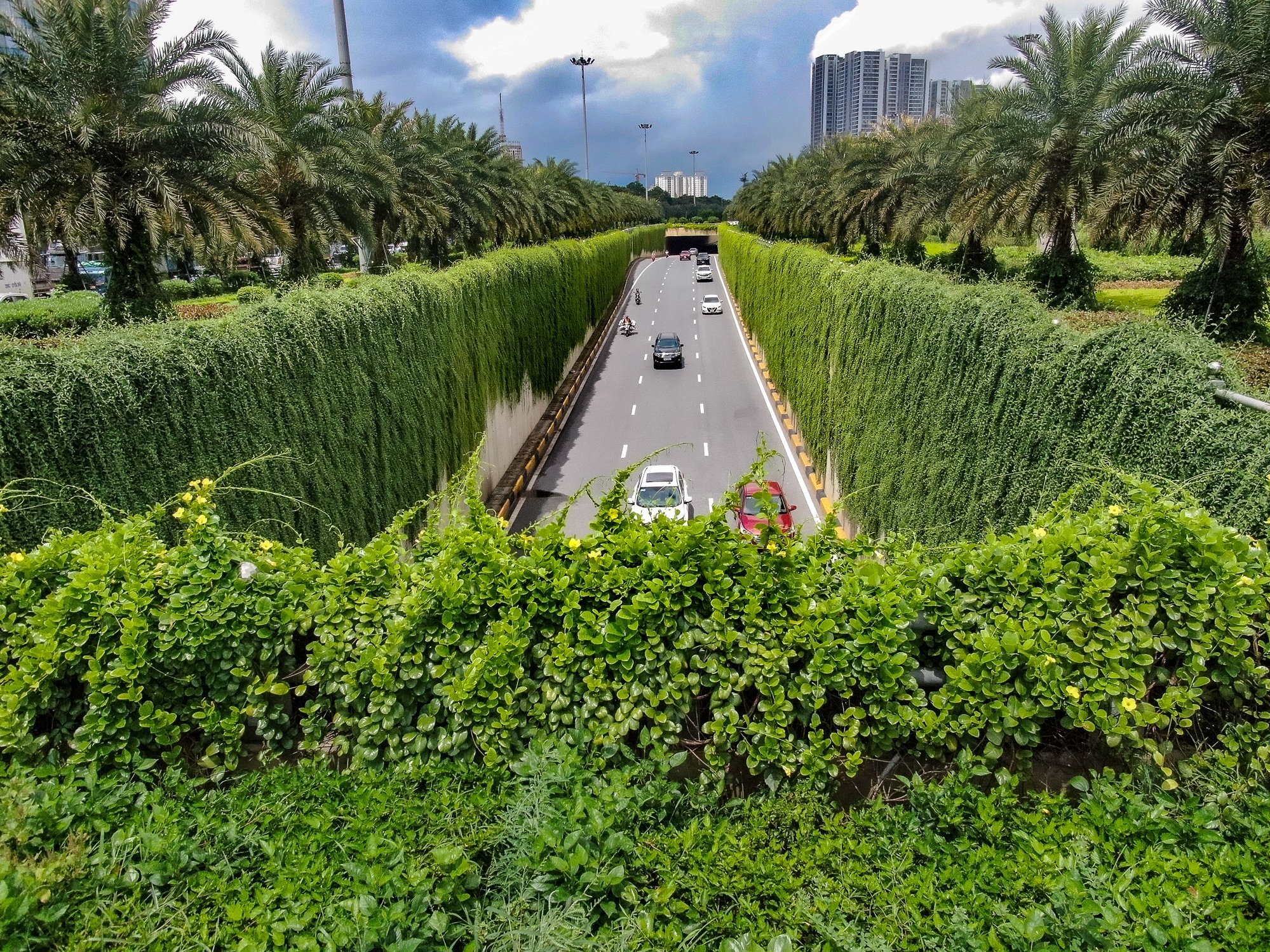 Nhưng điều khiến nút giao thông này trở lên xanh mướt chính là bởi cách trồng xen kẽ nhiều tầng cây xanh với đa dạng các loại cây. Không chỉ cúc tần, phía trên, những hàng cây chà là sinh sôi và phát triển mạnh, phủ xanh cả dọc dài tuyến đường.