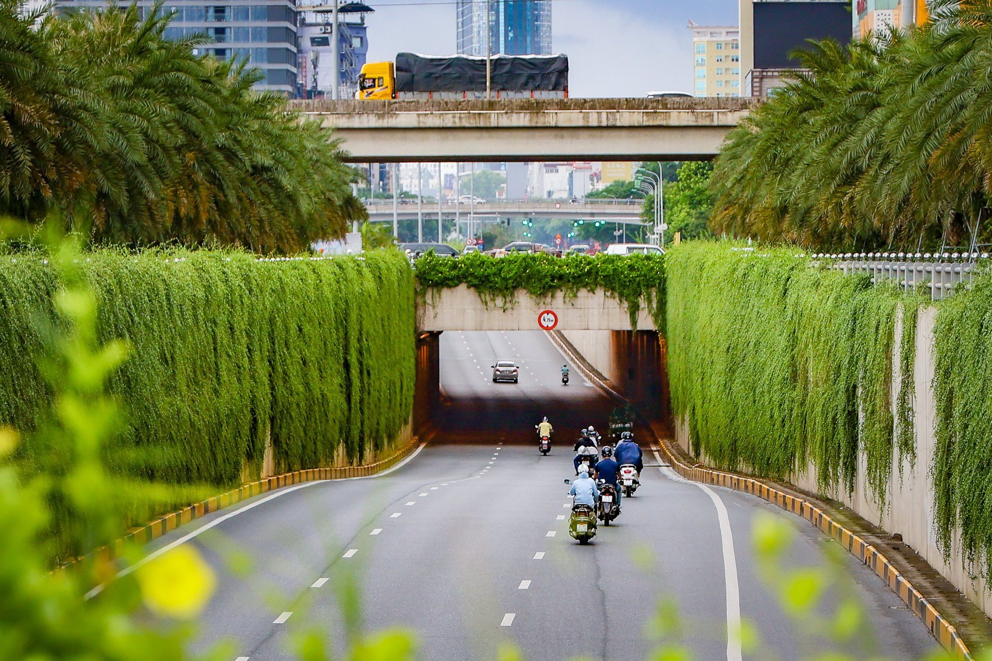 Những ngày hè oi bức, đi qua khu vực hầm chui Vành đai 3 (đoạn Trần Duy Hưng - Đại lộ Thăng Long, Hà Nội), ai nấy đều cảm thấy bất ngờ khi vách đường hầm được bao phủ bởi những dàn cây dây leo xanh mướt.
