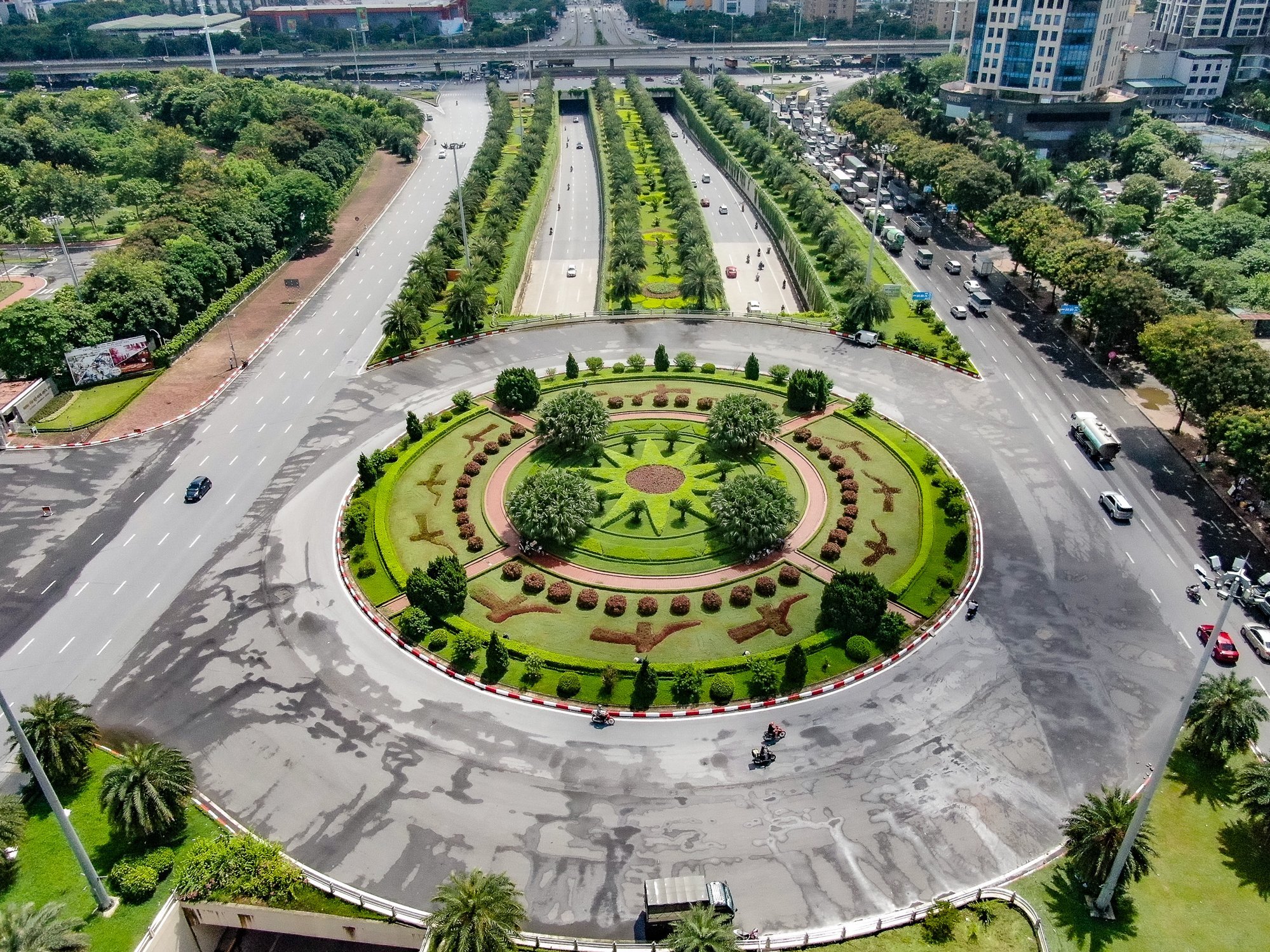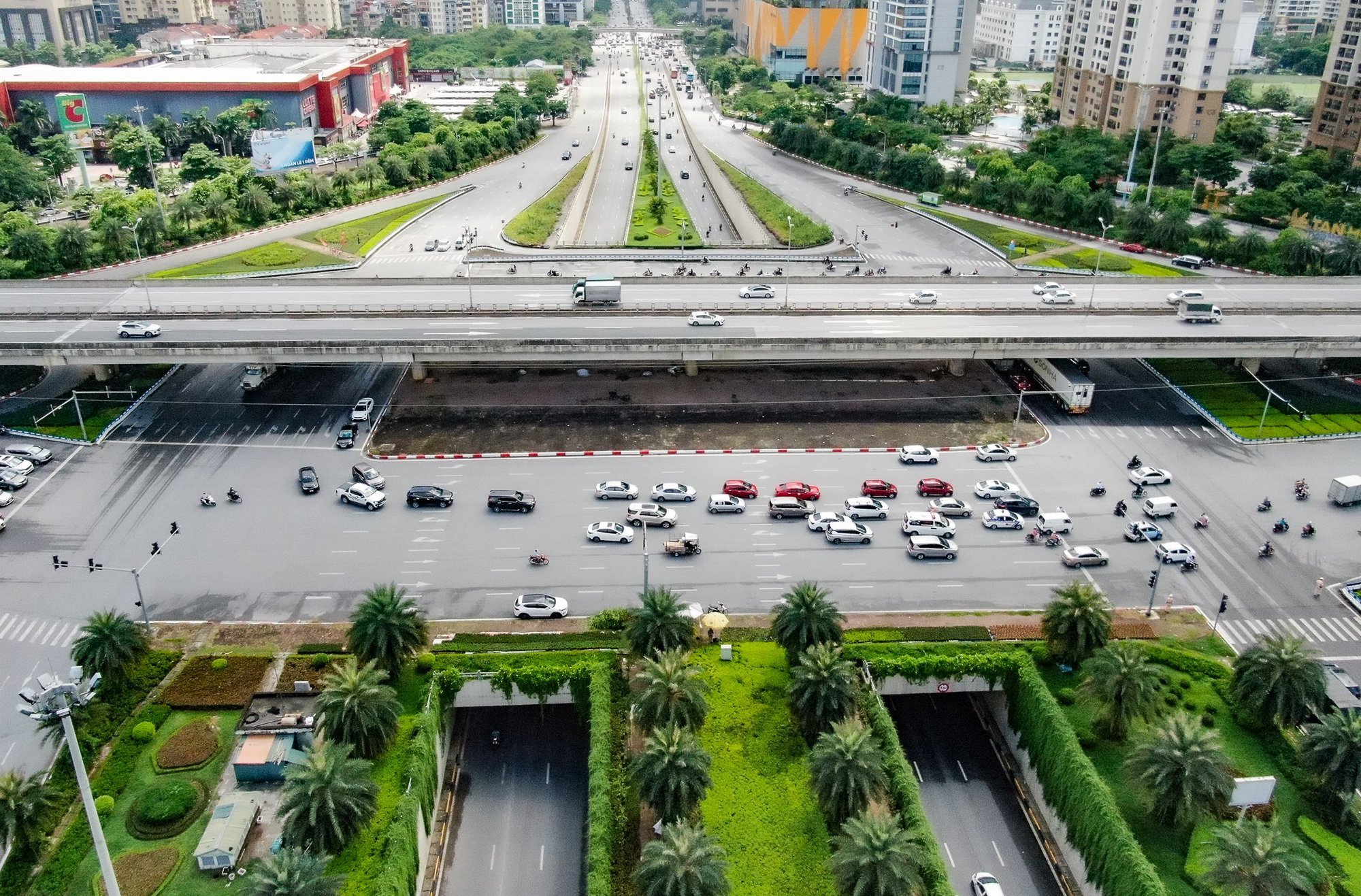 Nhìn từ trên cao, hầm chui Vành đai 3 nối Đại Lộ Thăng Long với tuyến đường Trần Duy Hưng mang vẻ đẹp hiện đại của Hà Nội.
