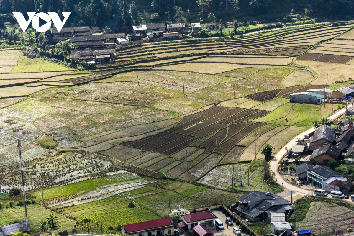| Cung đường xuyên qua bản in bóng những mái nhà cổ truyền. |