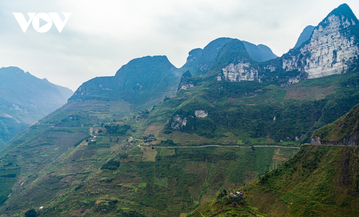 | Từ xa nhìn đoạn đường đèo Mã Pí Lèng như sợi chỉ cắt ngang dãy núi cao chất ngất. |
