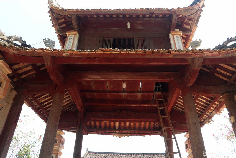 Từ ngoài đi vào, nghi môn là công trình thứ 2, đứng sau tam quan. Nghi môn đền Cả uy nghi tráng lệ kiểu lầu gác cung đình. Đây là một ngôi nhà có 4 cột (vuông), 2 tầng, 8 mái với các đầu đao cong vút. Ảnh: Huy Thư.