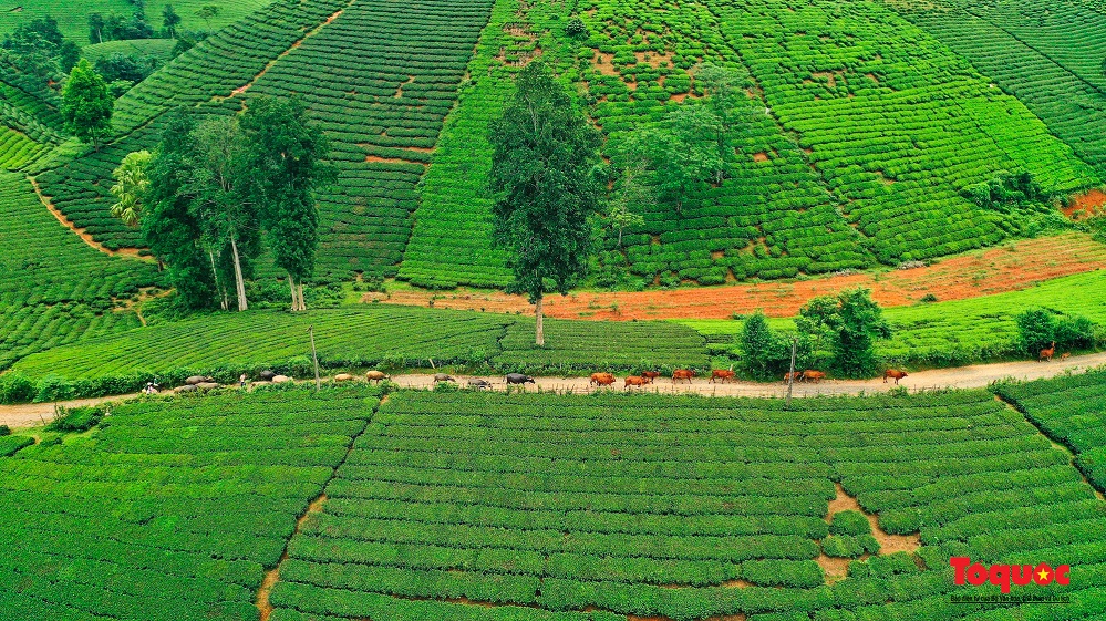 Đứng trên đỉnh đồi cao, du khách sẽ thu vào tầm mắt màu xanh tươi của lá chè giữa không gian bao la. Ảnh: toquoc.vn |