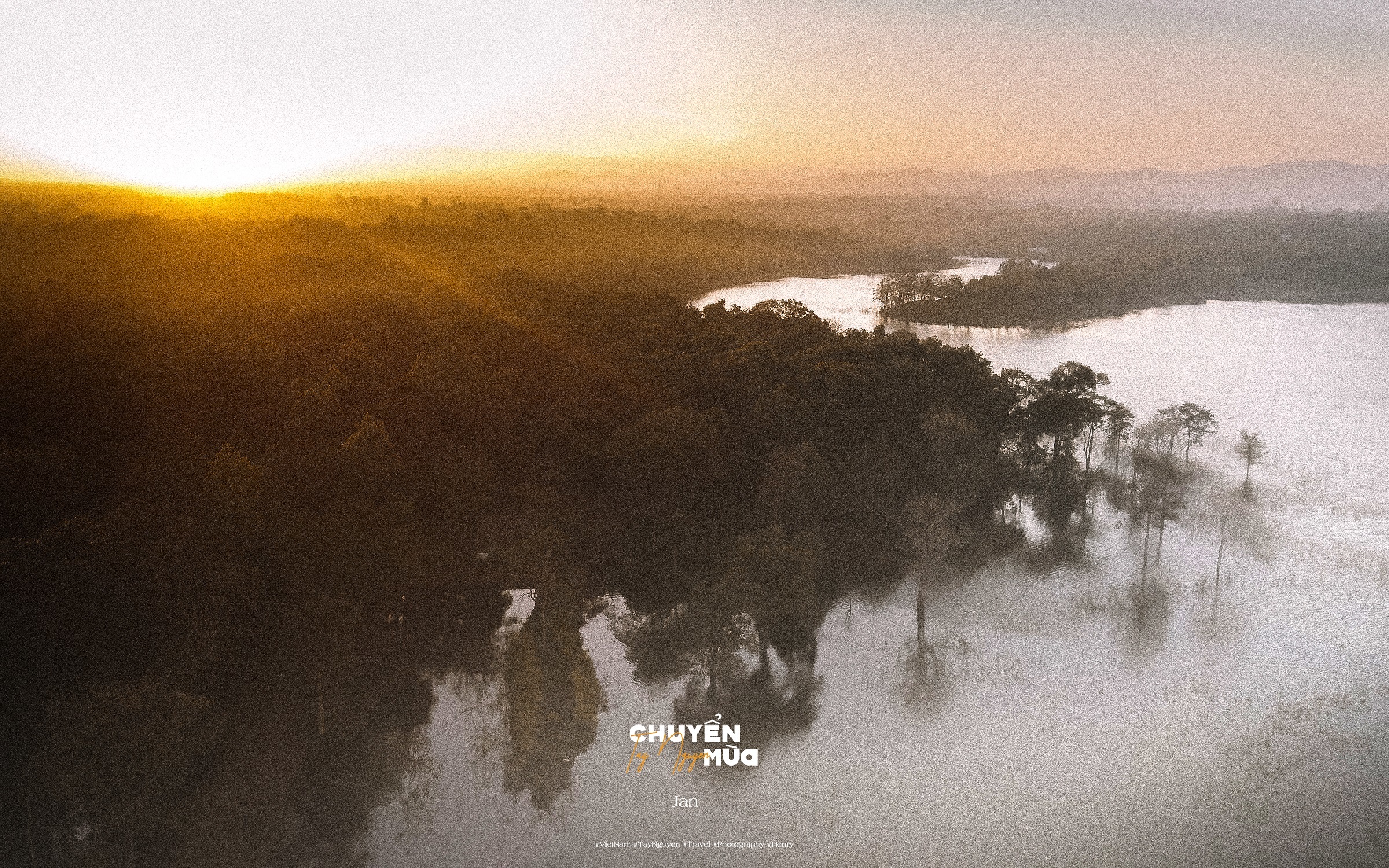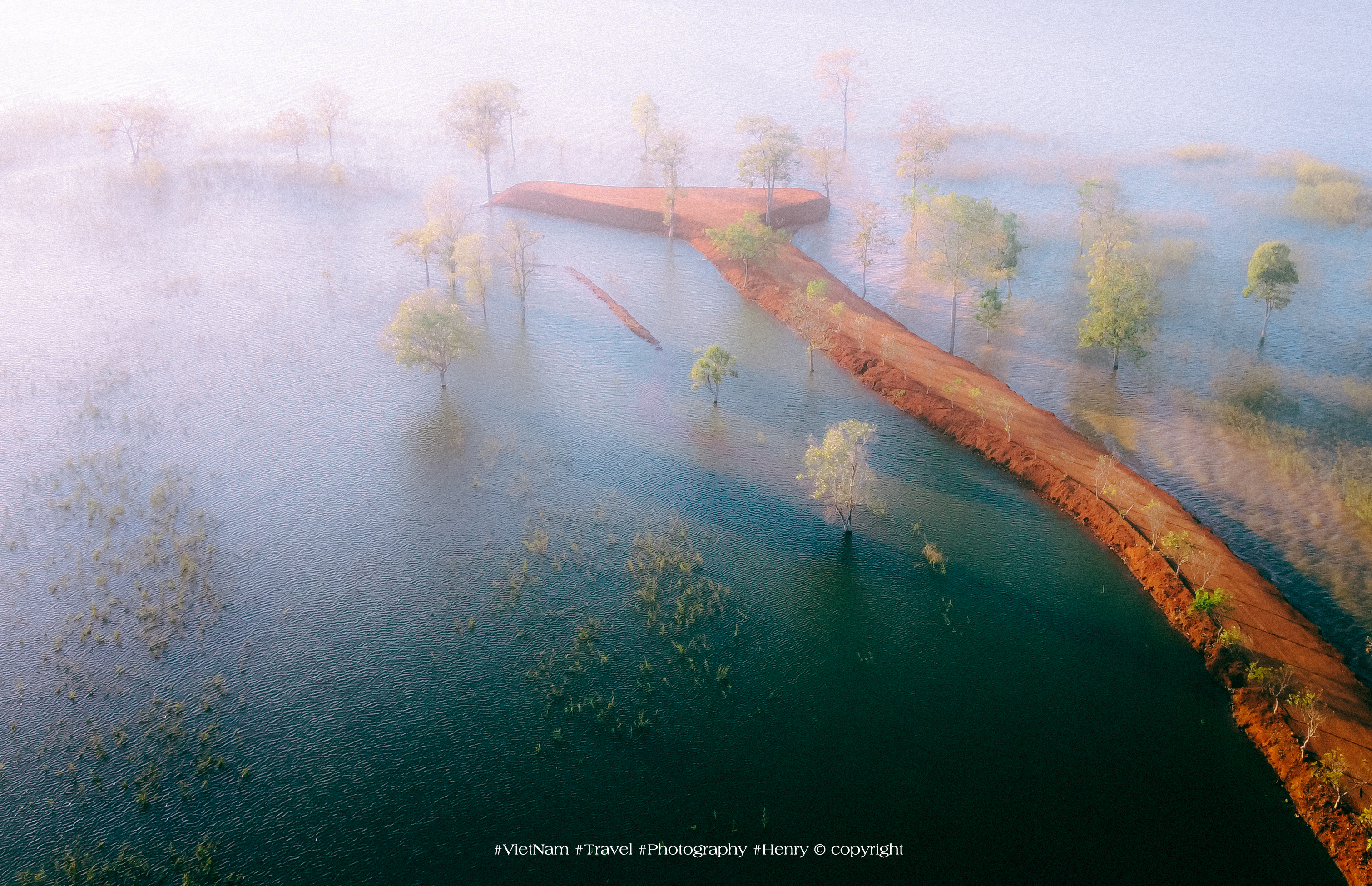 Khung cảnh sương mờ giăng kín mặt hồ vào sáng sớm. Ảnh: Lương Viết Cường |