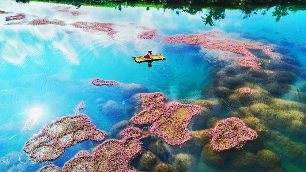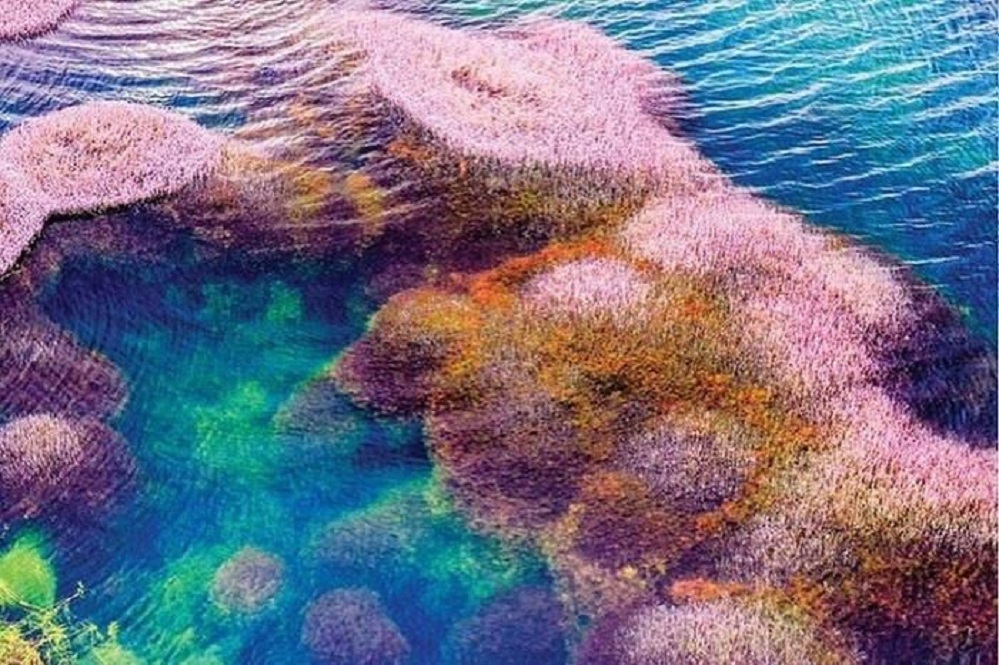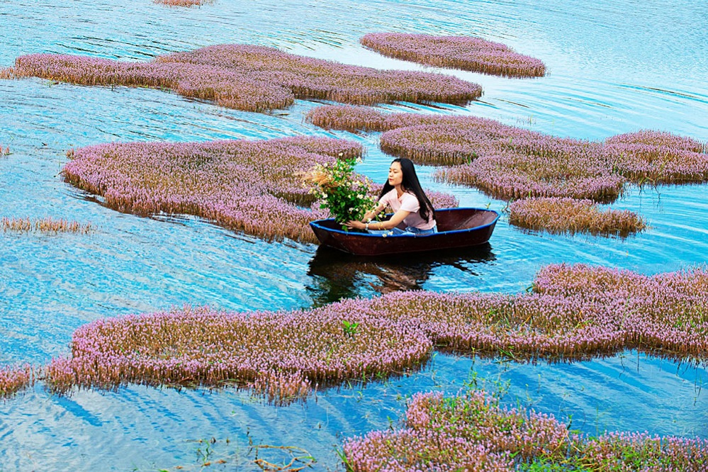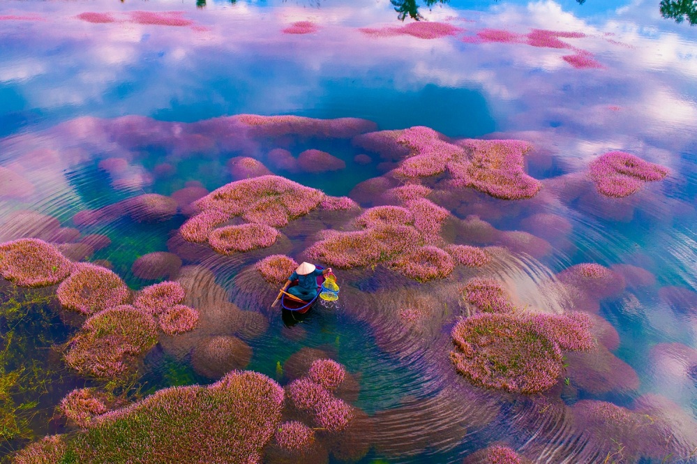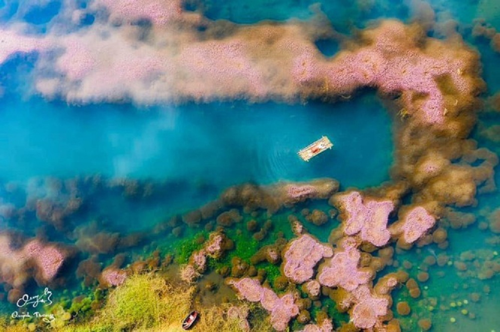 Những chùm tảo bung nở thành những khóm hoa màu hồng tím cực kỳ quyến rũ trên mặt nước. Ảnh: petrotimes.vn