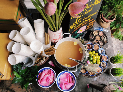 Chiếc mẹt mây xinh xắn với từng chén gốm nhỏ bày đủ các vị thảo mộc như kim ngân hoa, quế, la hán quả, chanh, sả... là nét đặc trưng nơi đây. Nếu không kịp ngồi đây để sống chậm bên bờ sông Hoài, bạn có thể mua mang đi. Với ống hút, lá sen và hoa sen, ly nước vốn trông nghệ thuật sẽ càng nổi bật hơn.