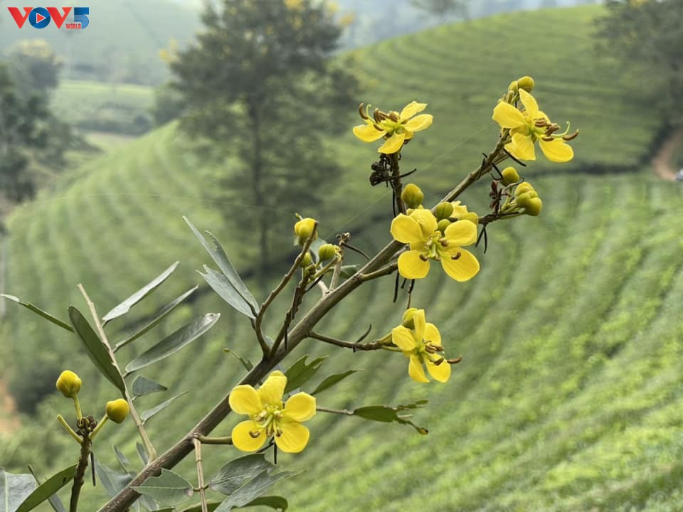 Vào tháng 11, những cây hoa muồng vàng cũng nở rộ bên những đồi chè tô điểm thêm vẻ đẹp đáng yêu ở nơi đây. |