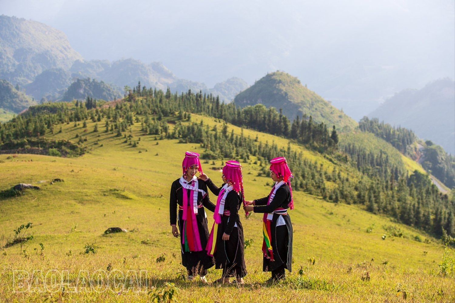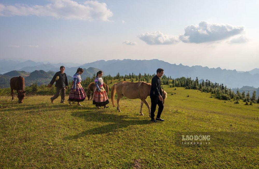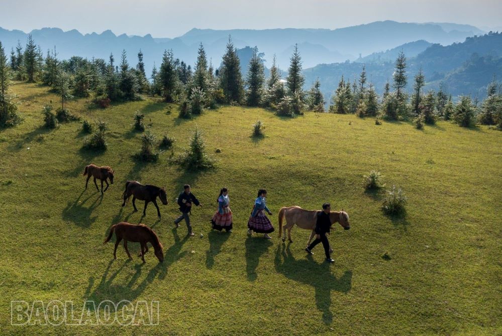 Những thiếu nữ dân tộc Dao cùng khám phá thảo nguyên. Ảnh: Báo Lào Cai