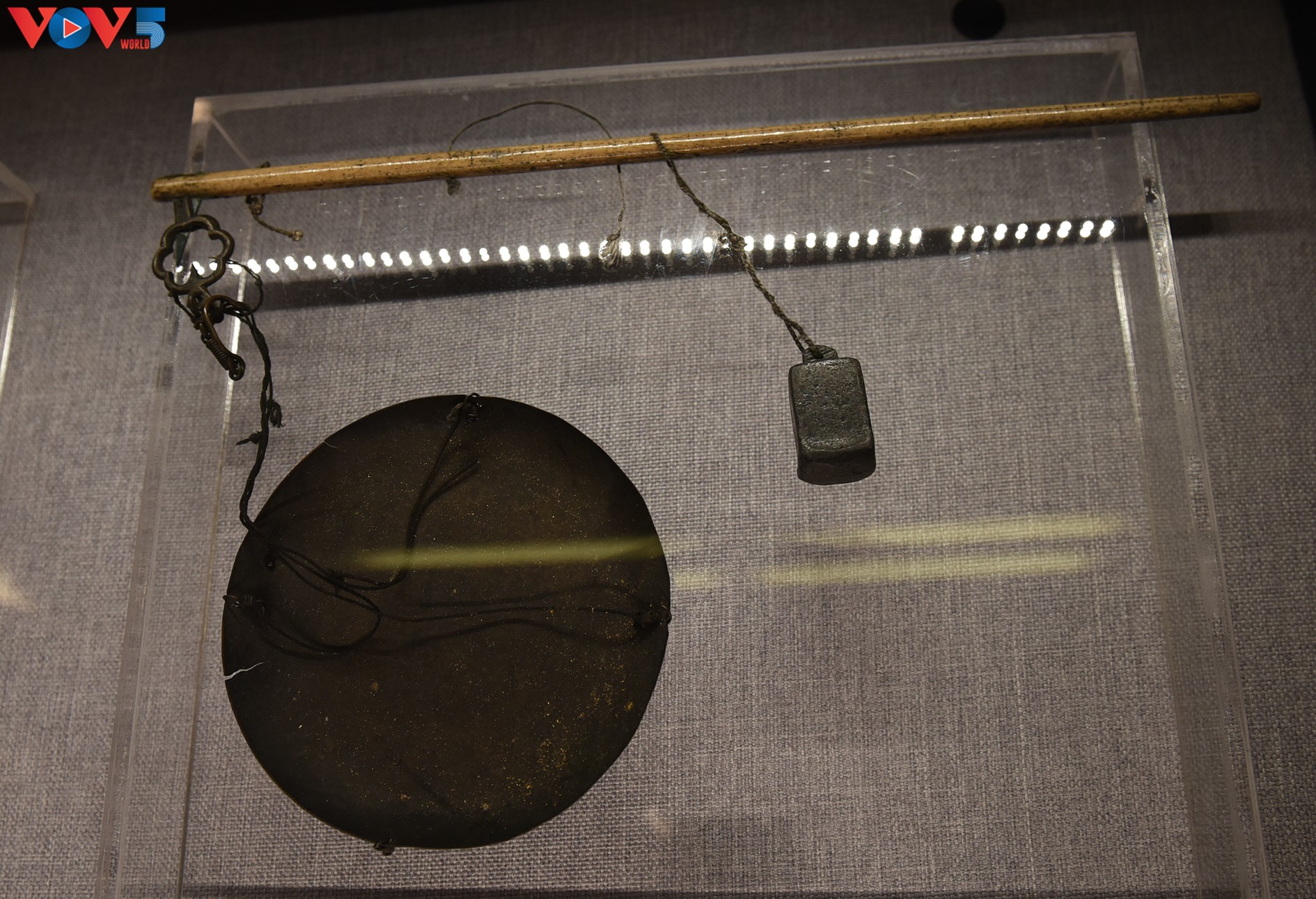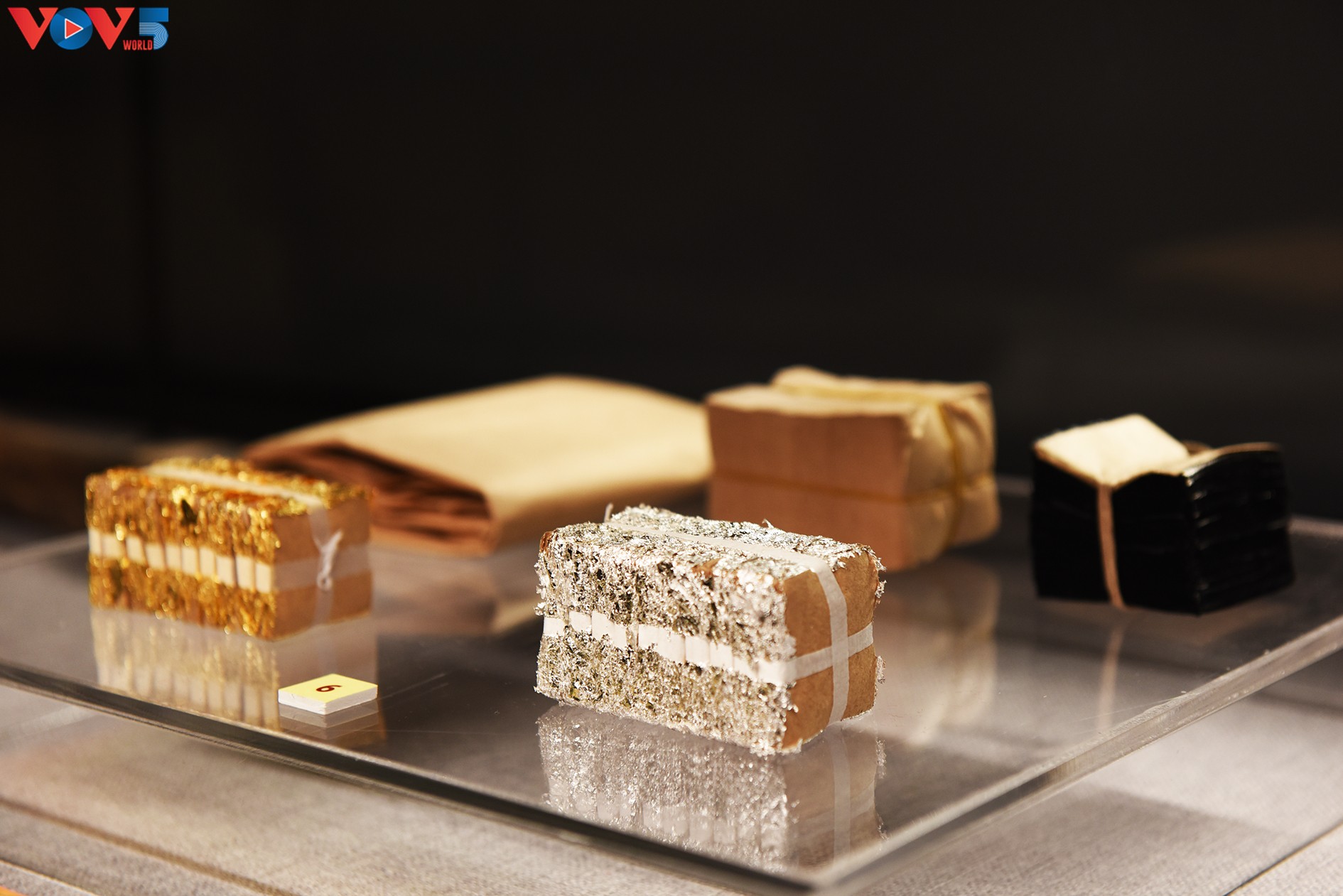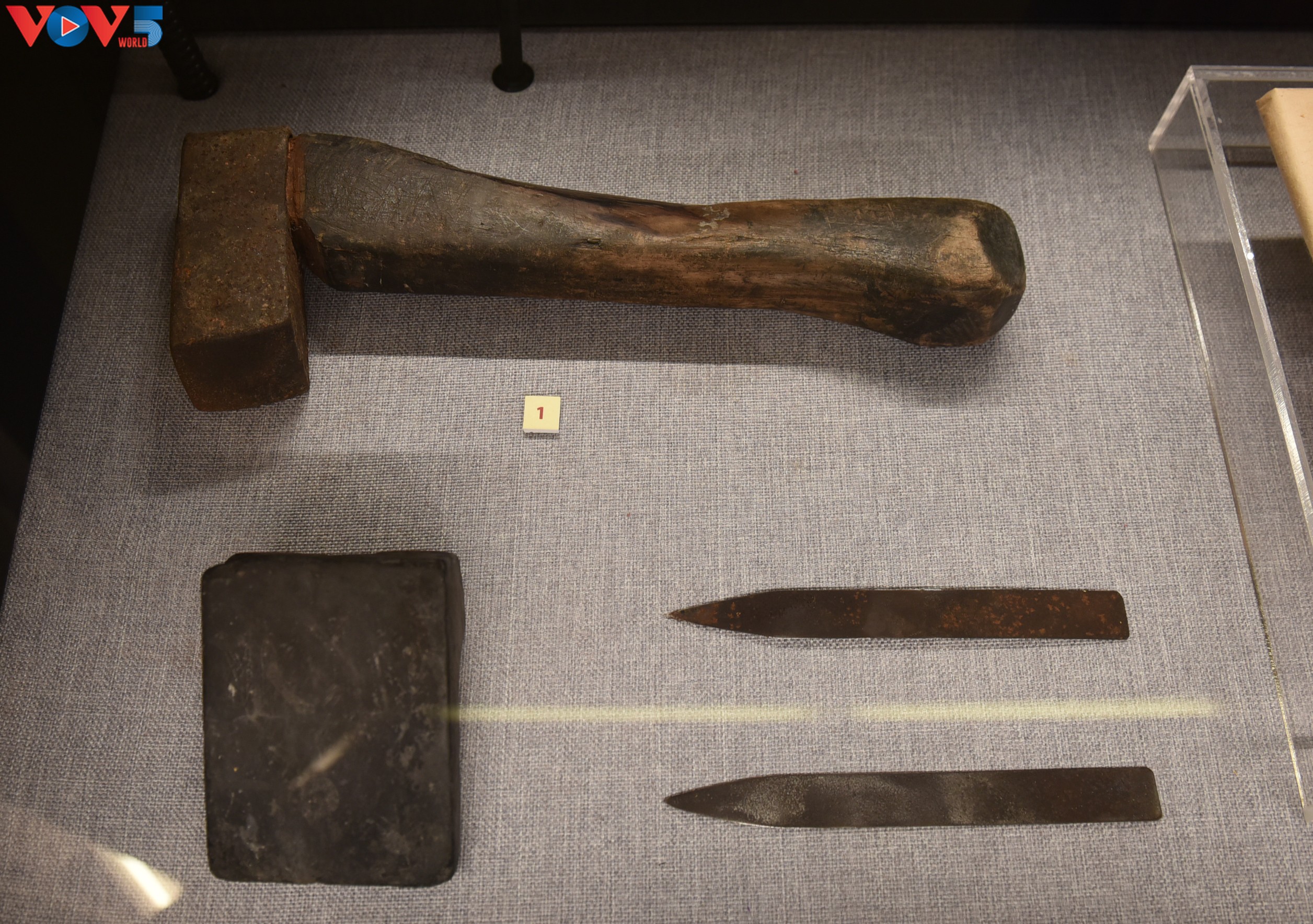 Công cụ, nguyên vật liệu, sản phẩm chế tác vàng quỳ của gia đình Nghệ nhân Lê Bá Chung, Kiêu Kỵ, Gia Lân, Hà Nội. Ảnh gồm búa dùng để chế tác vàng quỳ, đá dùng để lướt quỳ, bay dùng để gắp quỳ. |