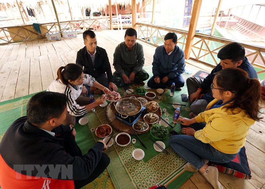 Khu vực Vịnh có nhà nổi do người dân làm bằng những nguyên vật liệu gần gũi với thiên nhiên tạo ra khung cảnh hiền hòa phục vụ du khách tham quan Vịnh. Ảnh: TTXVN