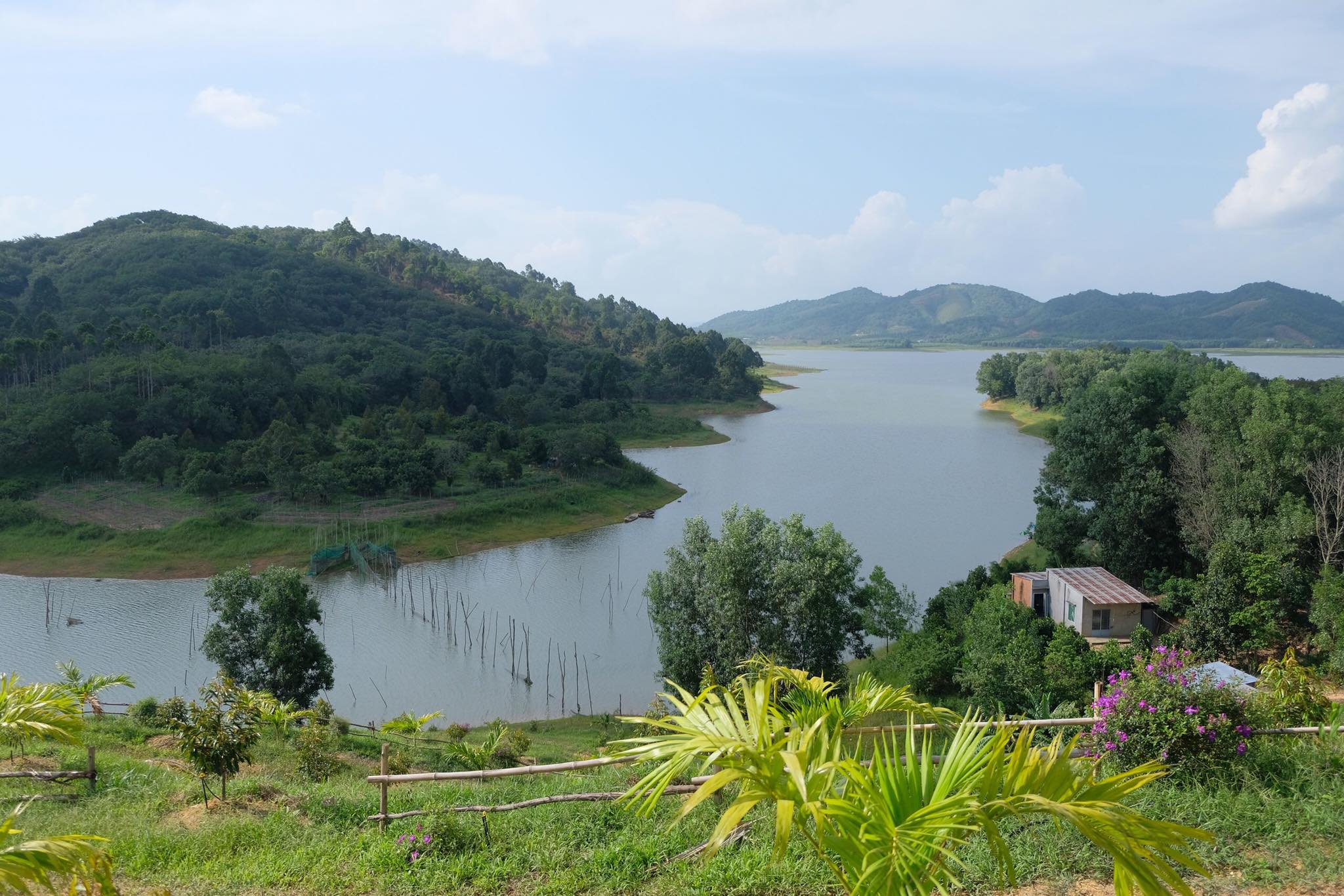 Từ nơi này, tầm mắt không vướng víu, có thể bao quát tất cả không gian quanh hồ, ngắm cồn cát với viền cỏ xanh rì quanh mép nước, những rặng cây Sao Dầu cổ thụ kiêu hãnh vươn ngọn trên đỉnh đồi, những bông cỏ Lau trắng xao xác gió, lác đác vài khóm cỏ Hồng kiêu kỳ đong đưa trên triền núi, rồi những tán Bạch Đàn khoáng đạt tỏa bóng mát, và mê mải thoai thoải những vườn Sầu Riêng non tơ lúp xúp đang góp vào sắc xanh phủ núi đồi…