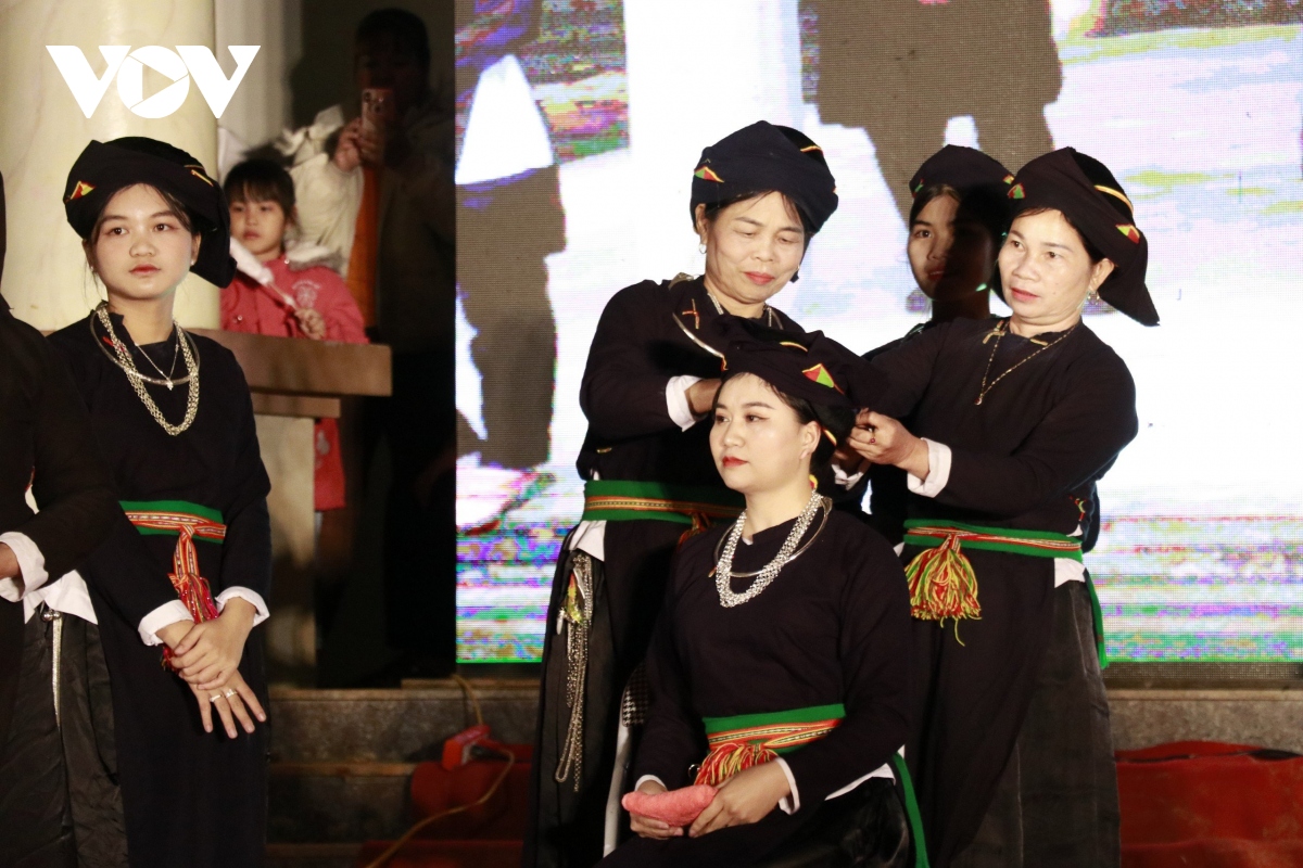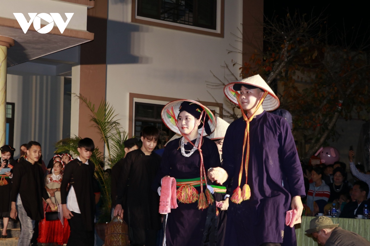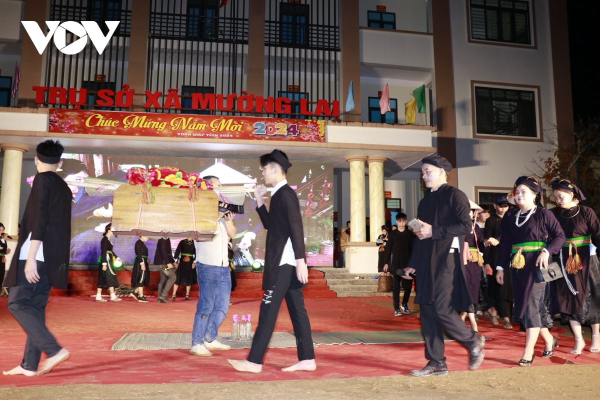 Tại Lễ hội năm nay, bà con Mường Lai tái hiện Lễ đón dâu của người Tày với hình thức sân khấu hóa. |