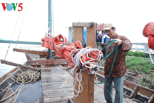 | Nghệ nhân đóng tàu Lê Đức Chắn, một trong số ít nghệ nhân đóng được thuyền ba vách, thực hành thao tác giong buồm. Nghệ nhân Lê Đức Chắn là truyền nhân đời thứ 17 của nghề đóng tàu, thuyền truyền thống ở làng đảo Hà Nam, thị xã Quảng Yên. Ông cũng là người trực tiếp thiết kế và đóng tàu ba vách này. |