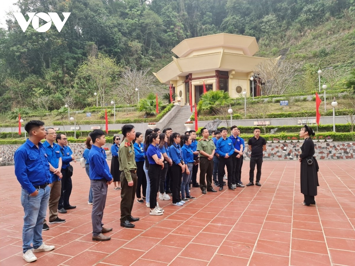 Các đoàn khách được hướng dẫn viên giới thiệu về lịch sử hào hùng của thế hệ đi trước. |