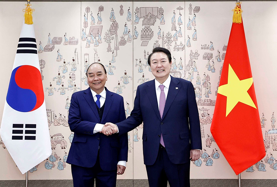 Với sự tin tưởng vào tương lai tốt đẹp của quan hệ hai nước, Chủ tịch nước Nguyễn Xuân Phúc và Tổng thống Yoon Suk-yeol đã nhất trí ra Tuyên bố chung về việc nâng cấp quan hệ giữa Việt Nam và Hàn Quốc lên mức “Đối tác chiến lược toàn diện”. Ảnh: TTXVN |