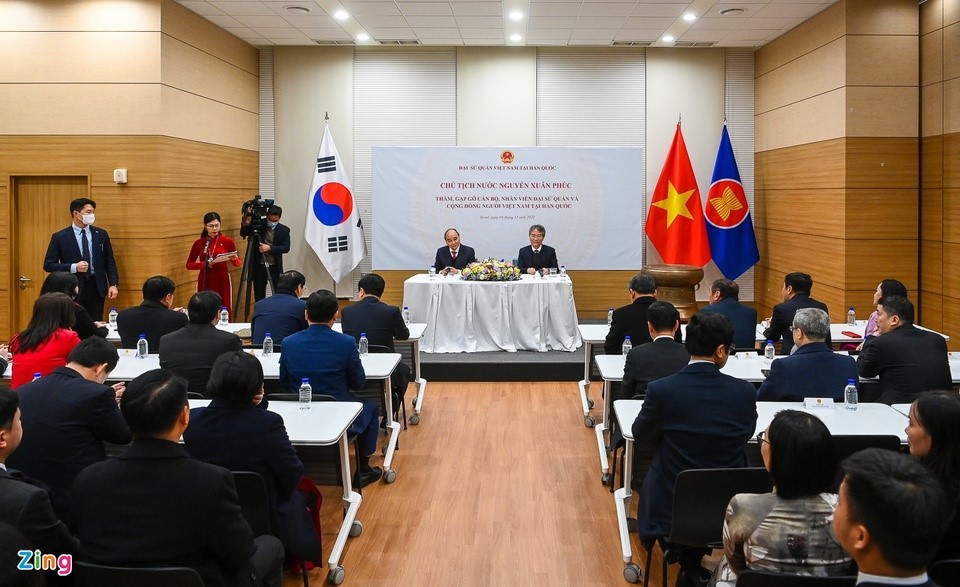Chủ tịch nước Nguyễn Xuân Phúc gặp gỡ cán bộ, nhân viên Đại sứ quán và cộng đồng người Việt Nam tại Hàn Quốc. Ảnh: Việt Linh/ Zing News |
