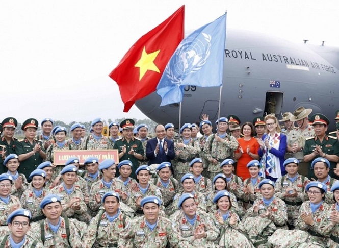 Chủ tịch nước Nguyễn Xuân Phúc dự lễ xuất quân đội công binh đầu tiên của Việt Nam tham gia gìn giữ hòa bình LHQ tháng 4/2022. Ảnh: VOV |