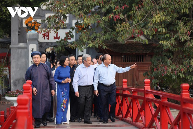 Tổng thư ký LHQ và Chủ tịch nước Nguyễn Xuân Phúc đi dạo tại cầu Thê Húc. Đây là hoạt động mang dấu ấn văn hóa và trải nghiệm trong lịch trình thăm chính thức Việt Nam của Tổng thư ký LHQ. Ảnh: VOV |