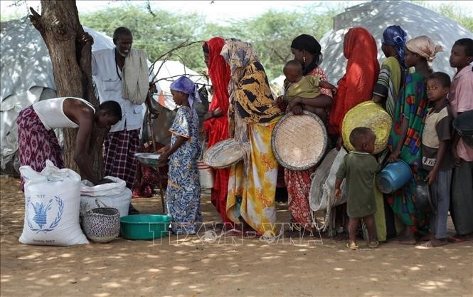 Phân phát lương thực viện trợ của Chương trình Lương thực thế giới (WFP) cho người dân tại trại tị nạn ở Mogadishu, Somalia ngày 16/6/2009. Ảnh: AFP/TTXVN |