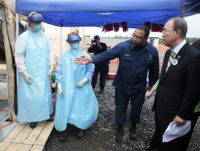 Tổng thư ký LHQ Ban Ki-moon thăm một cơ sở y tế điều trị bệnh nhân Ebola tại Monrovia, Liberia ngày 19/12/2014. Ảnh: AFP |