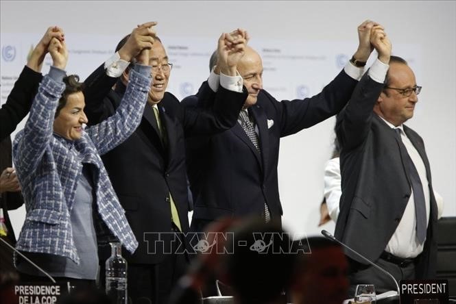Từ trái sang: Thư ký điều hành Hội nghị LHQ về Biến đổi Khí hậu 2015 (COP 21) Christiana Figueres, Tổng thư ký LHQ Ban Ki-moon, Ngoại trưởng Pháp Laurent Fabius và Tổng thống Pháp Francois Hollande vui mừng khi Thỏa thuận Paris 2015 về chống biến đổi khí hậu được thông qua, tại Le Bourget (Pháp), ngày 12/12/2015. Ảnh: AFP/TTXVN |