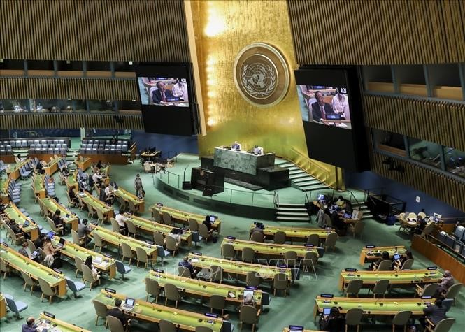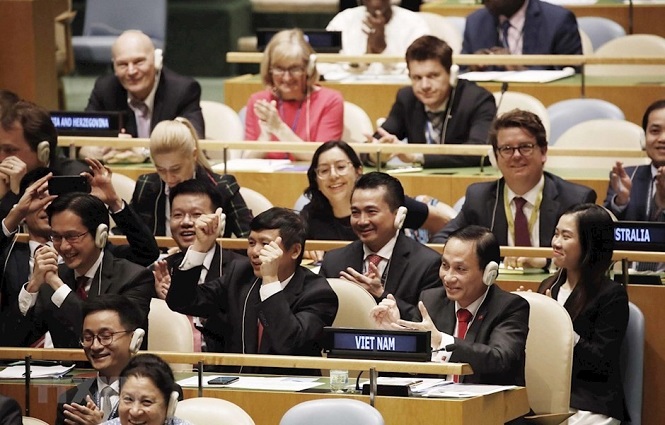 Vào lúc 22h10 tối 7/6/2019 giờ Việt Nam (11h10 giờ New York), với 192/193 phiếu ủng hộ, Đại hội đồng Liên hiệp quốc đã bầu Việt Nam làm thành viên không thường trực Hội đồng Bảo an nhiệm kỳ 2020 - 2021. Ảnh: TTXVN |