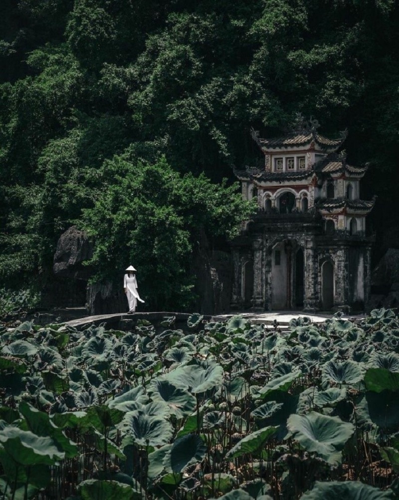 Hình ảnh áo dài, nón lá đặc trưng khi nhắc tới phụ nữ Việt Nam xuất hiện bên đầm sen trước danh thắng Tam Cốc Bích Động ở Ninh Bình. Ảnh: Ryosuke Kosuge |