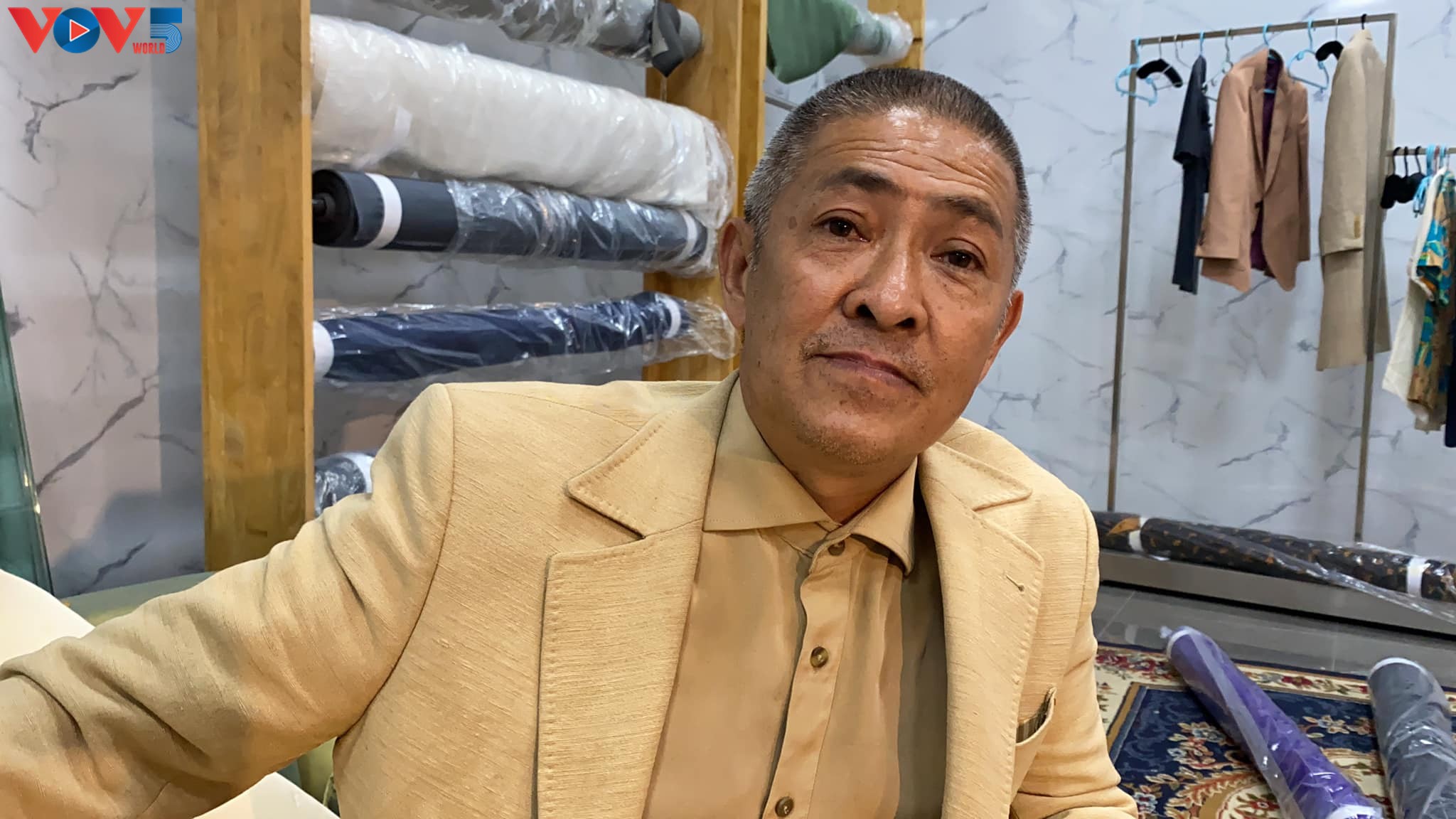 Ông Huỳnh Tấn Phước – Chủ tịch công ty TNHH Vietnam Silk House bên mẫu vải mới. |