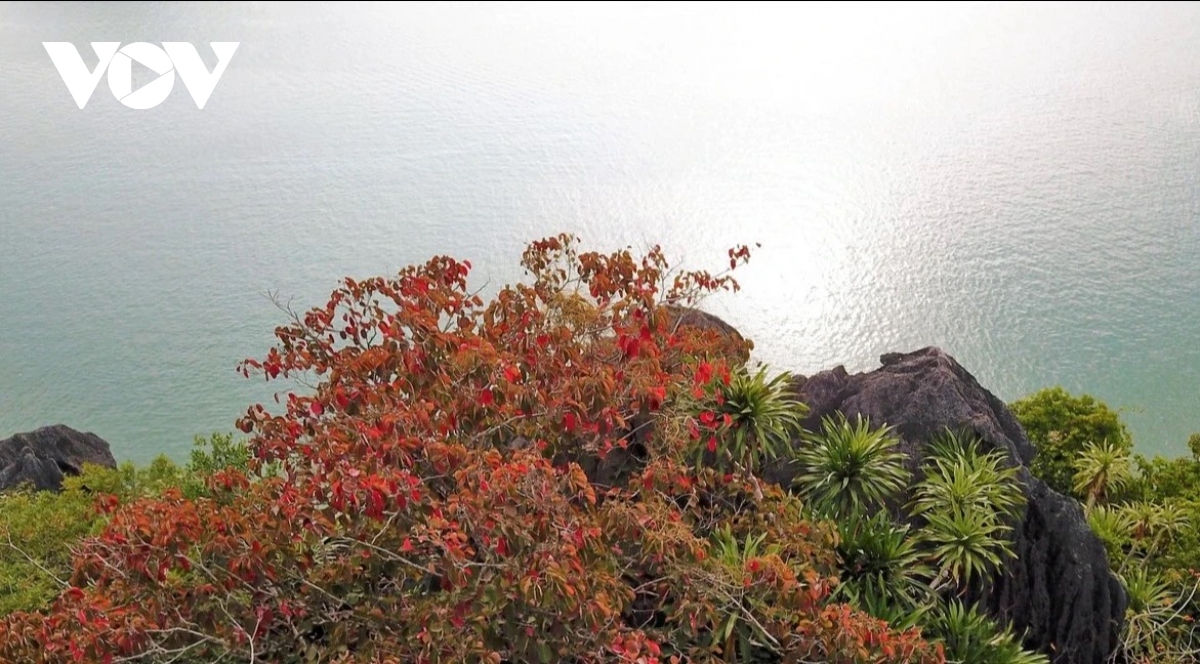 Một cây Sòi vừa thay lá đỏ nở rực giữa lòng di sản vịnh Hạ Long. Đây là loại cây phổ biến trên các núi đá trên vịnh Hạ Long. |