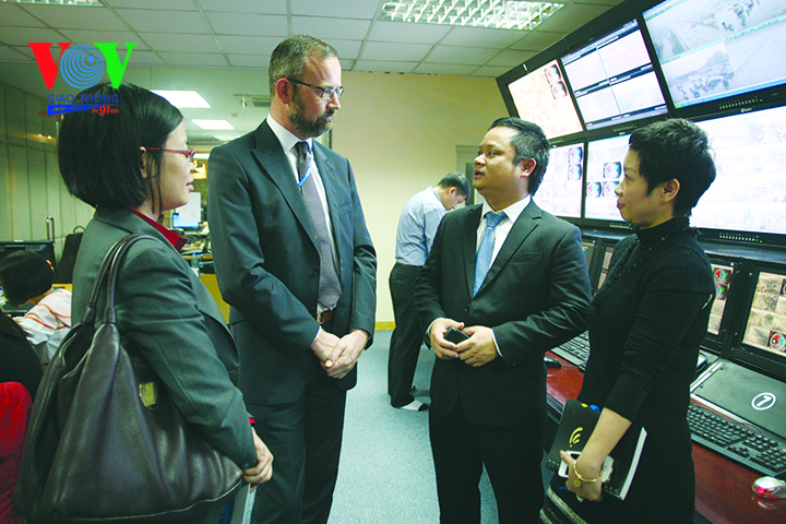 Nguyên Giám đốc Kênh VOV Giao thông Vũ Minh Tuấn giới thiệu hoạt động của Kênh VOV Giao thông với các đoàn khách quốc tế tới thăm Đài TNVN - tháng 3/2014