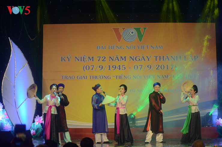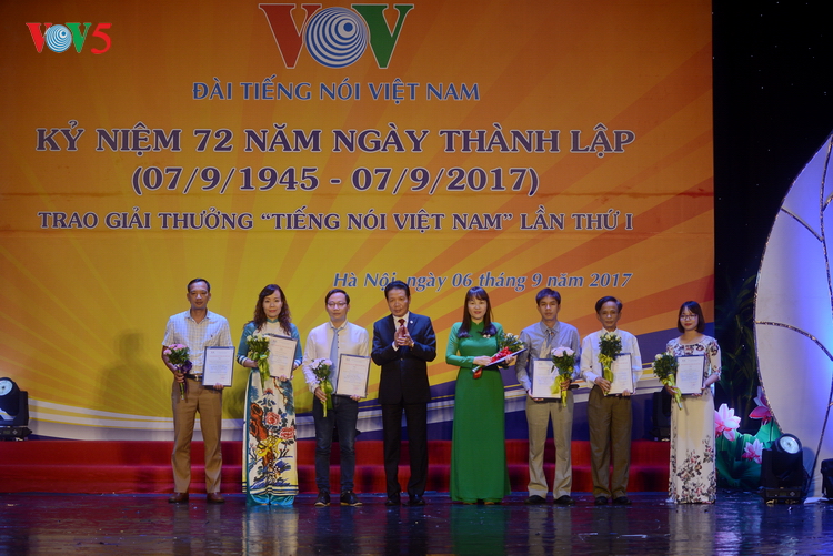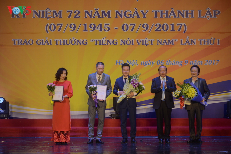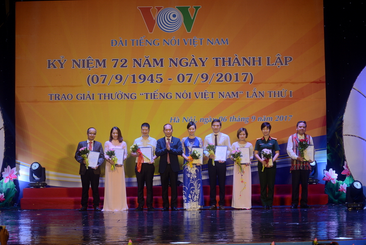 | Nằm trong chuỗi các hoạt động kỷ niệm 72 năm ngày thành lập Đài Tiếng nói Việt Nam, năm nay, lần đầu tiên Đài TNVN trao Giải thưởng "Tiếng nói Việt Nam" nhằm tôn vinh các tác giả, nhóm tác giả có tác phẩm, công trình xuất sắc về báo chí, văn học nghệ thuật, kỹ thuật, công nghệ, nghiên cứu khoa học, những tập thể, cá nhân có đóng góp tích cực trong lĩnh vực sáng tác, biểu diễn, những gương mặt phát thanh viên, người dẫn chương trình xuất sắc. |
