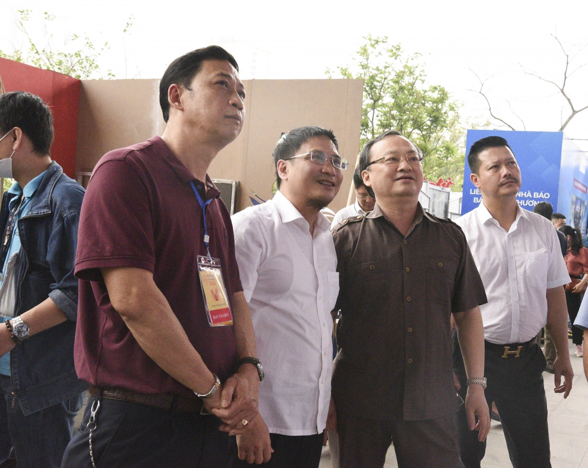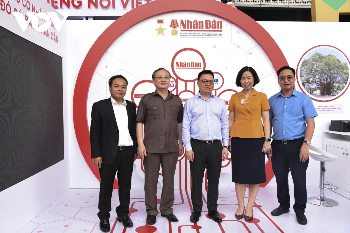 Chủ tịch Hội nhà báo, lãnh đạo VOV, TTXVN tham quan và chụp ảnh lưu niệm tại gian trưng bày của Báo Nhân Dân. |