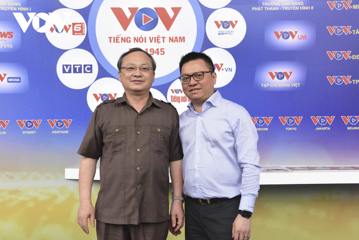 Ông Lê Quốc Minh, Ủy viên Ban Chấp hành Trung ương Đảng, Phó Trưởng ban Tuyên giáo Trung ương, Chủ tịch Hội Nhà báo Việt Nam, Tổng Biên tập Báo Nhân Dân chụp ảnh lưu niệm cùng Tổng Giám đốc VOV Đỗ Tiến Sỹ. |