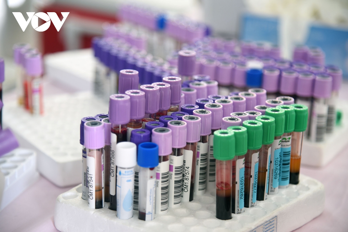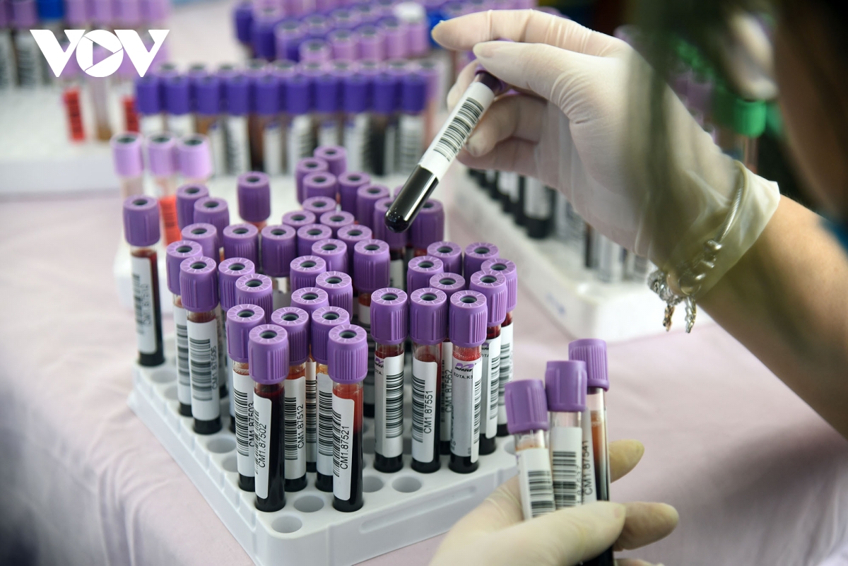 Kỹ thuật viên tiến hành phân loại máu sau khi nhận từ các tình nguyện viên.