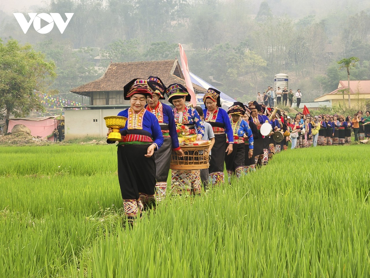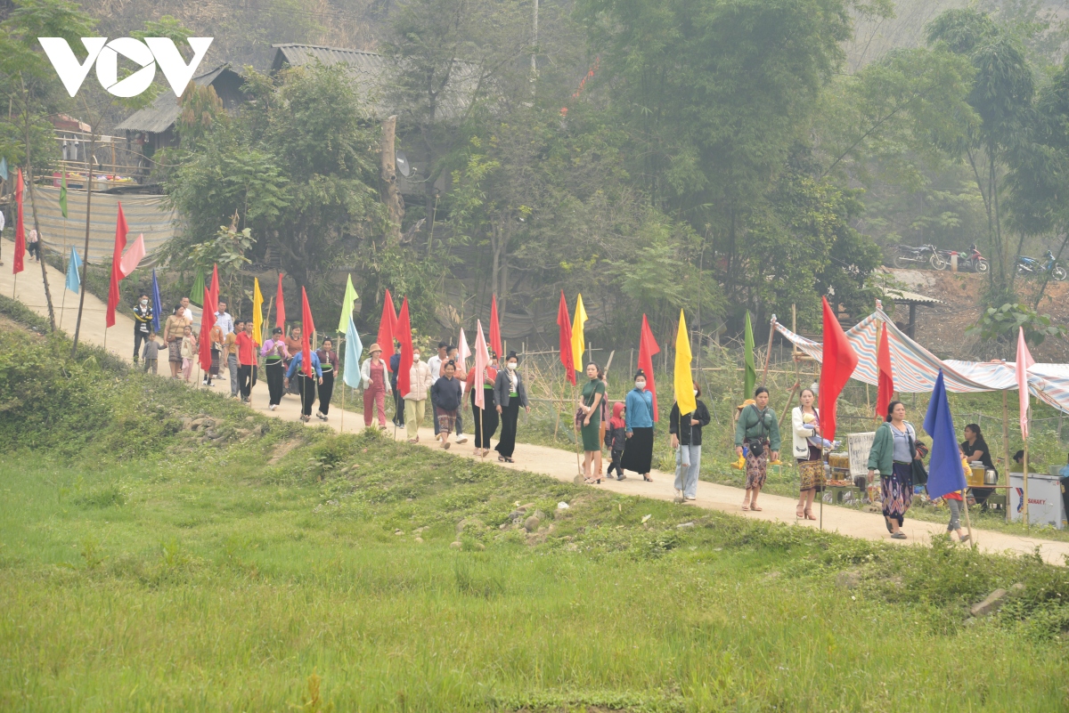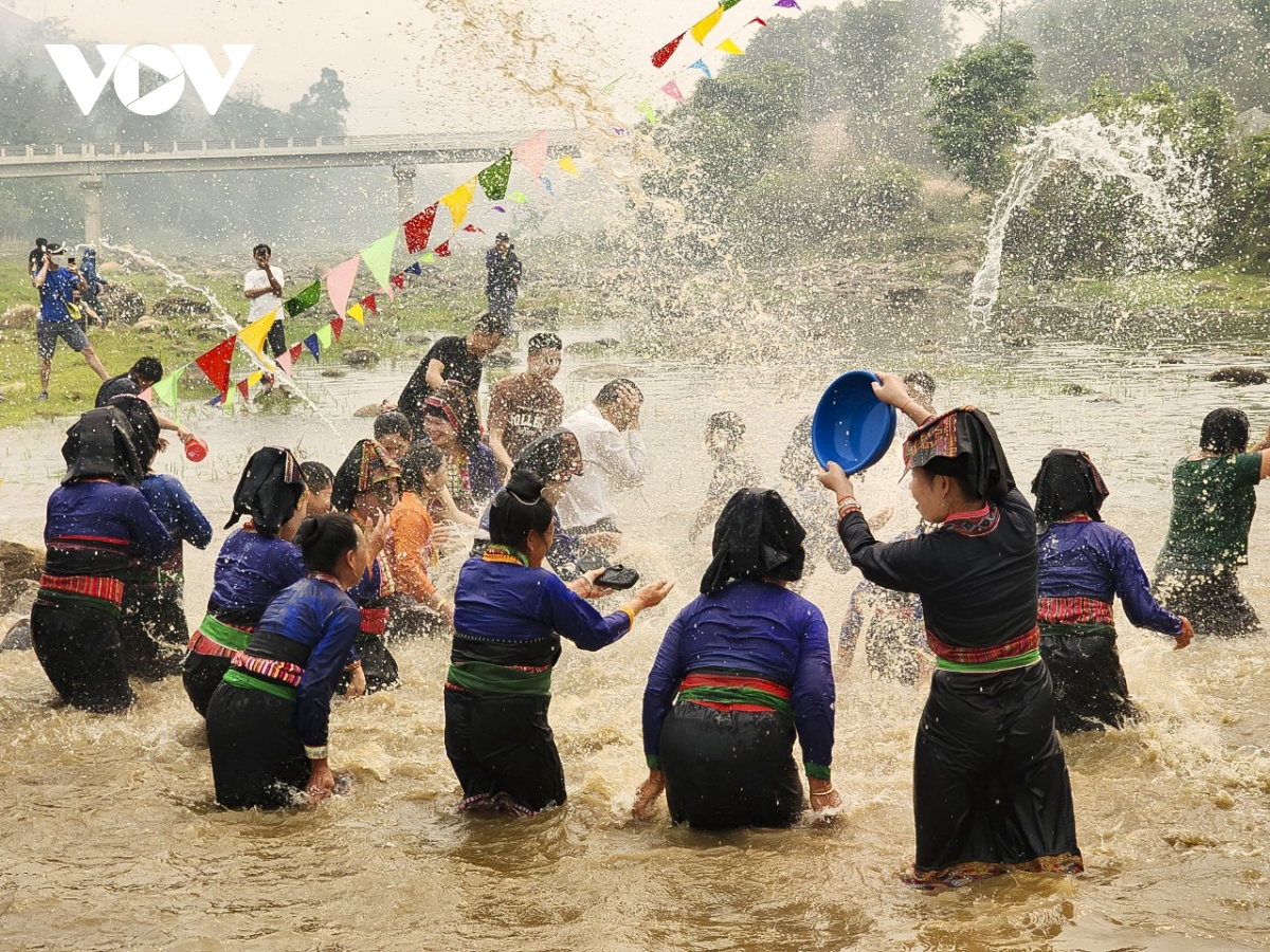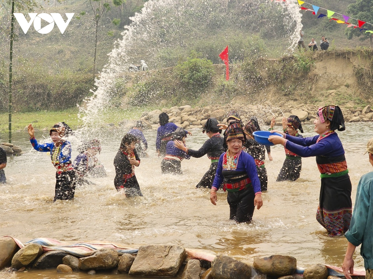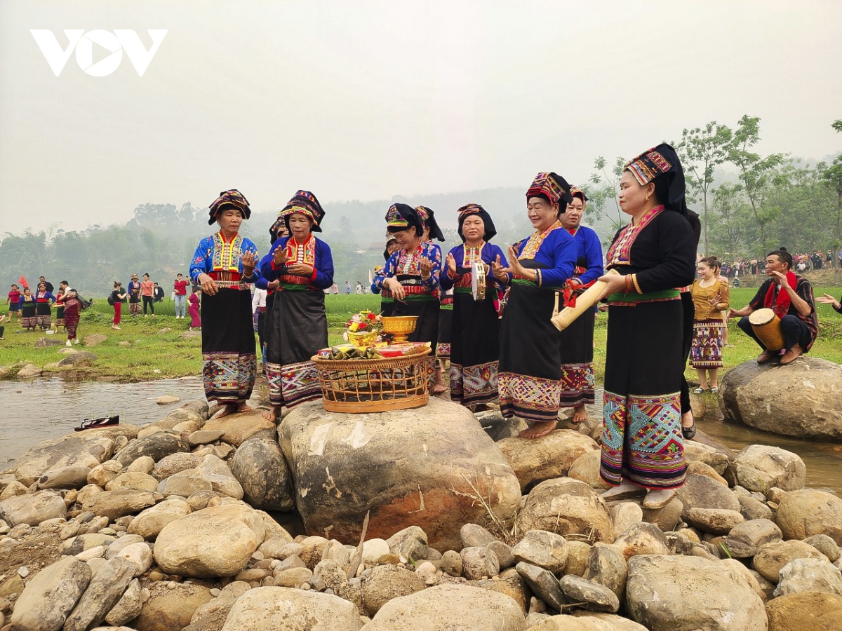 Kết thúc các phần lễ, Người dân và du khách sẽ cùng nhau ra suối để thực hiện nghi thức dâng tế lễ vật, cúng mời thần suối. |
