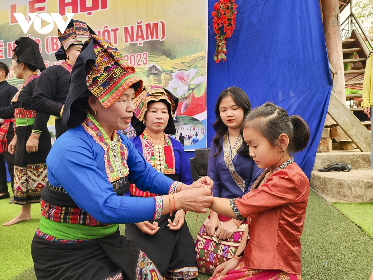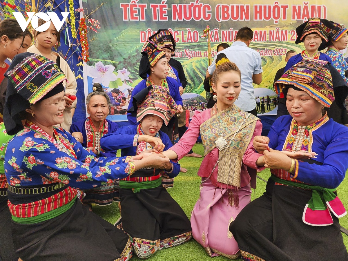 Nghi lễ Bun huột nặm của người Lào tại Na Sang là một trong nghi lễ truyền thống, thường được tổ chức vào đúng thời điểm Tết truyền thống của người Lào. Đây là sự kiện có ý nghĩa quan trọng trong đời sống văn hóa tinh thần của cộng đồng. Vì ngoài ý nghĩa để bà con bày tỏ lòng biết ơn đối với tổ tiên và thần linh còn là dịp để đoàn tụ gia đình thôn bản, mọi người cùng tham gia những trò chơi và những điệu dân vũ truyền thống trong không gian văn hóa bản địa của dân tộc mình. Trong ảnh: Nghi thức buộc chỉ cổ tay cầu may mắn. |