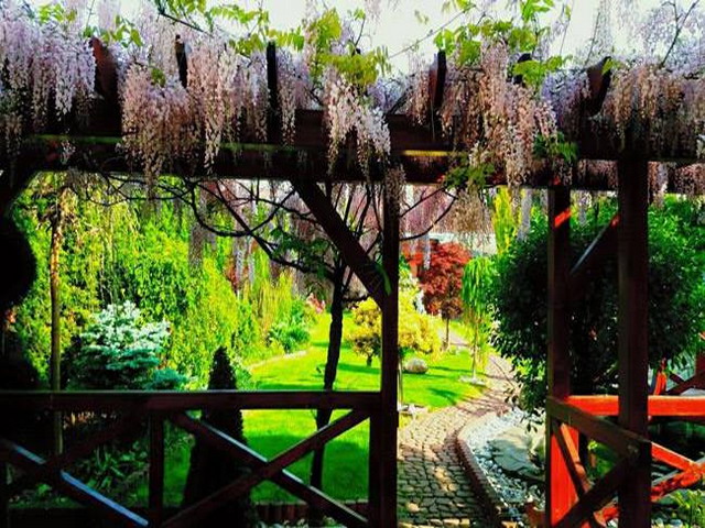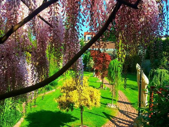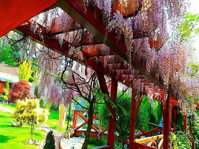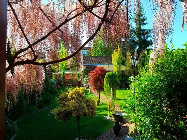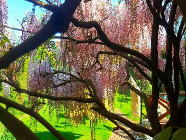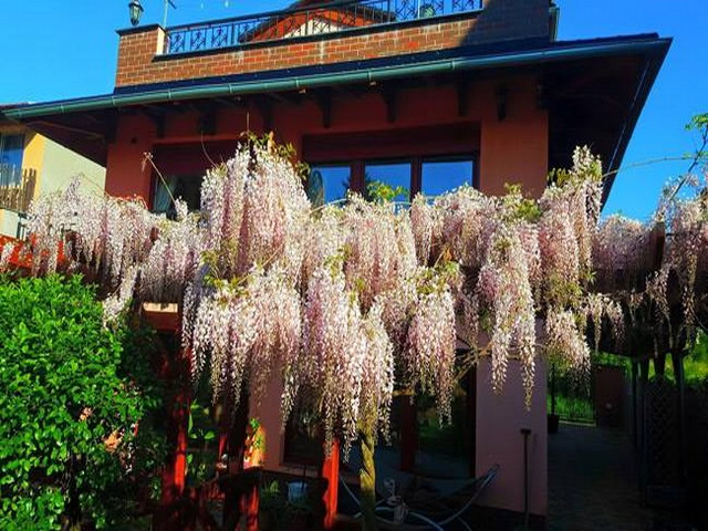 Đặc biệt là giàn hoa tử đằng tím hồng đẹp lung linh phủ kín trước hiên nhà. Loài hoa này chị trông cách đây 6 năm và năm nay, cây trổ bông nhiều, dày đặc. Để có giàn hoa đẹp như vậy, chị Cúc đã phải cắt tỉa rất cẩn thật, và không để cành cây quá dài. Đồng thời, muốn cây phát triển tốt thì phải thường xuyên tỉa những cành cây nhỏ đâm từ gốc. Ngoài hoa tử đằng, vườn hoa tuyệt đẹp của chị Cúc còn có hoa mẫu đơn, hoa hồng, dạ yến thảo...